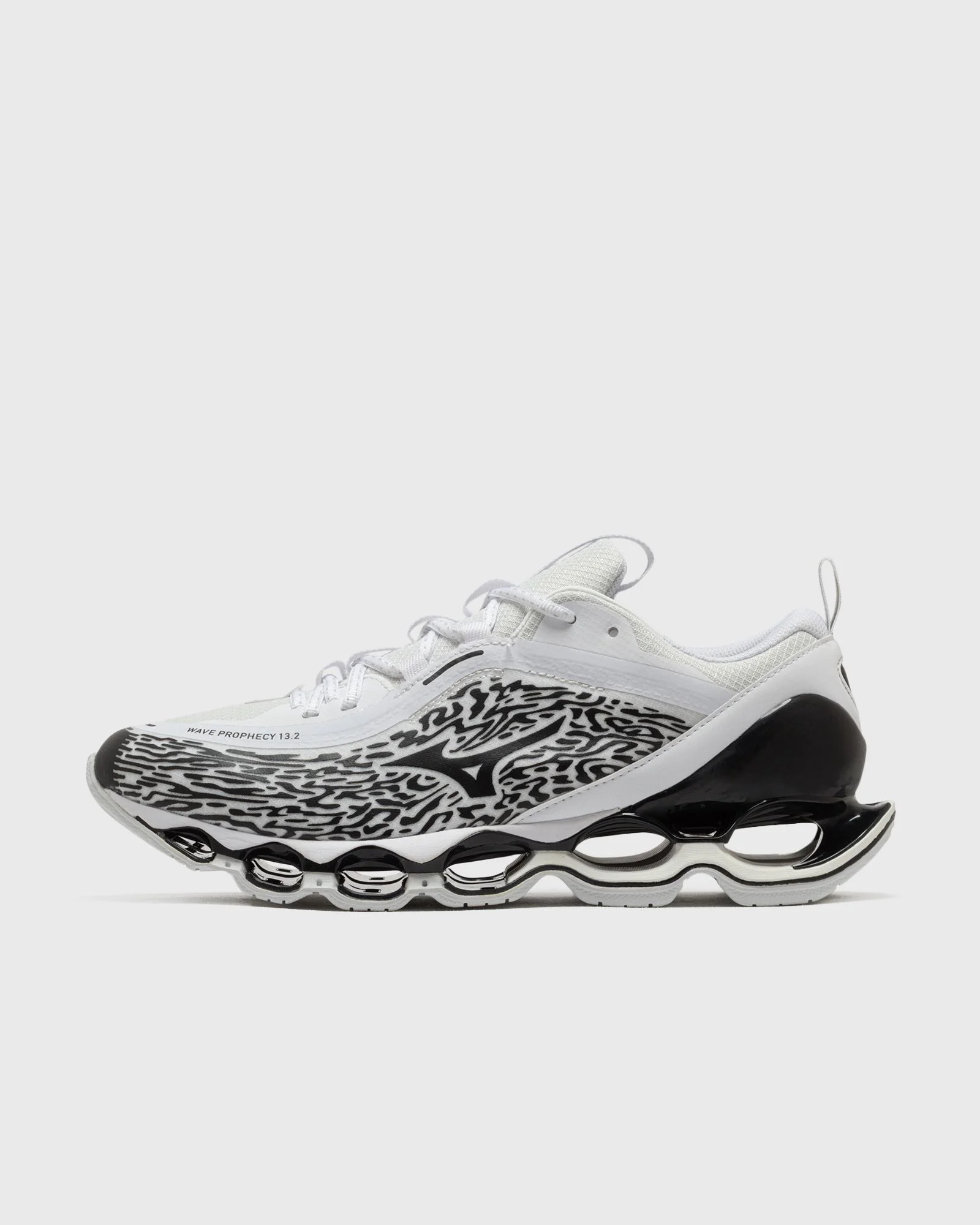 The Mizuno Wave Prophecy 13.2 pushes the boundaries of technical footwear and confidently brings performance-driven running design into the lifestyle arena. At its core, the signature Mizuno Infinity Wave Plate provides exceptional cushioning, stability, and energy return, while SmoothRide technology supports a smooth transition from heel to toe. A lightweight mesh upper with an organic print meets the sculptural, architectural sole, emphasizing the futuristic look of the silhouette. The RunBird logo and Wave Prophecy 13.2 branding round out the design, combining technical innovation with distinctive style. Article number: D1GA261304 Gender: men Color: white/black Material: 30% Rubber, 70% Synthetic/Textile