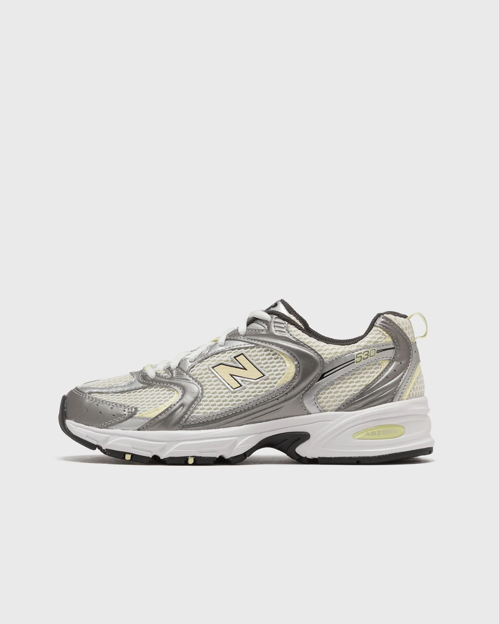 The original version of the New Balance MR530 combined the aesthetics of the turn of the millennium with the reliability of a running shoe. This relaunched version of the 530 gives the performance-oriented design a modern, everyday look. A segmented ABZORB midsole is combined with a classic mesh and synthetic upper that features sweeping curves and angles for a distinctive high-tech look. - The ABZORB midsole absorbs impact forces through a combination of cushioning and compression resistance - Synthetic/mesh upper - Adjustable lace-up closure for a customized fit Article number: U530ADG Gender: women Color: SILVER METALLIC Material: 30% Rubber, 70% Synthetic/Textile