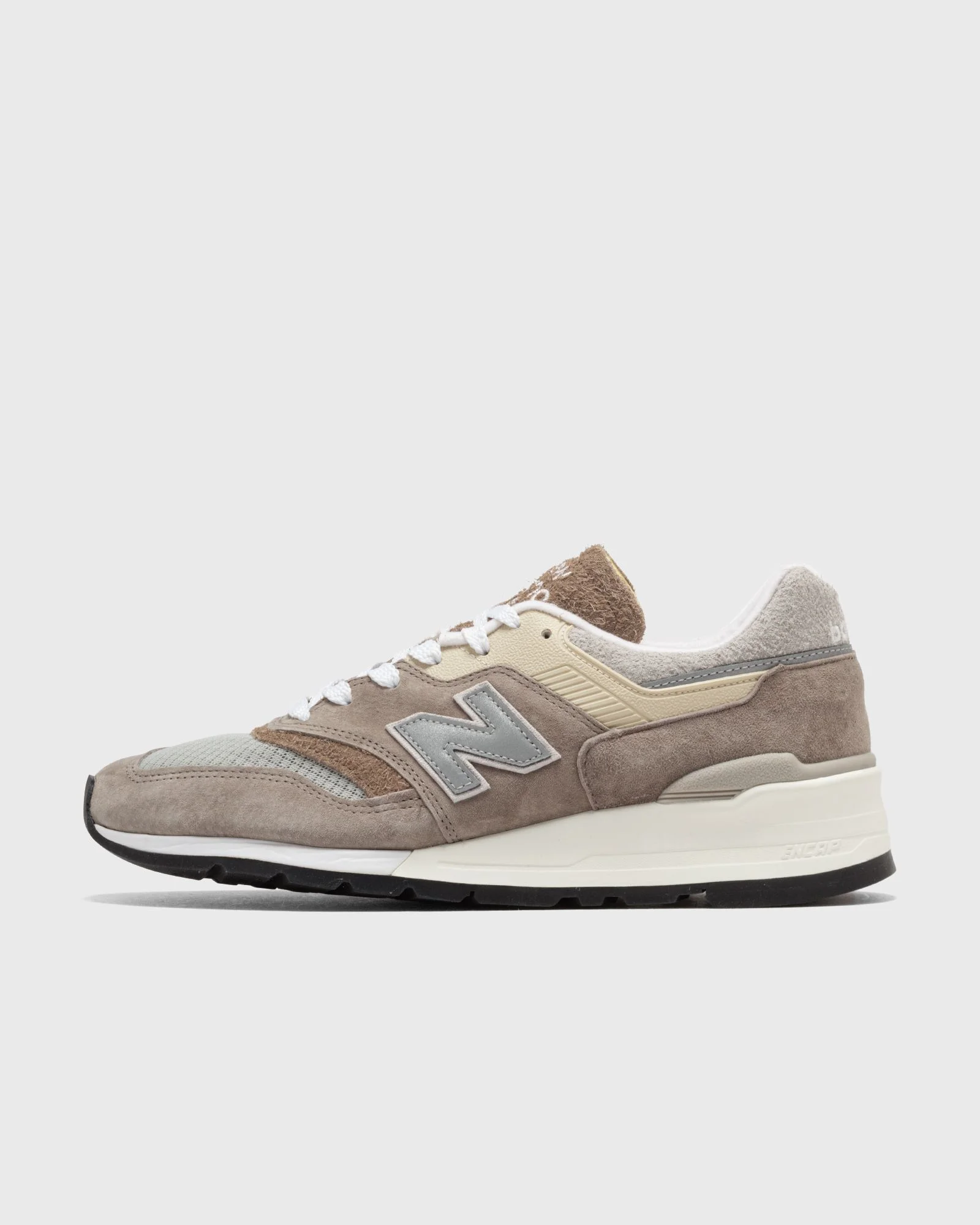 The New Balance 997 was originally launched in 1991 as part of the 990 series. Even today, the 997 model is one of New Balance's most popular shoes thanks to its strikingly sporty silhouette. The NB 997 combines New Balance comfort with the usual high-quality materials and excellent workmanship. - ENCAP midsole cushioning made of lightweight foam material with durable polyurethane rand - Lightweight EVA foam cushioning in the midsole and heel - Durable foamed rubber outsole - Made in USA Article number: U997MG Gender: men Color: LIGHT MUSHROOM Material: Full: 100% Leather/Synthetic