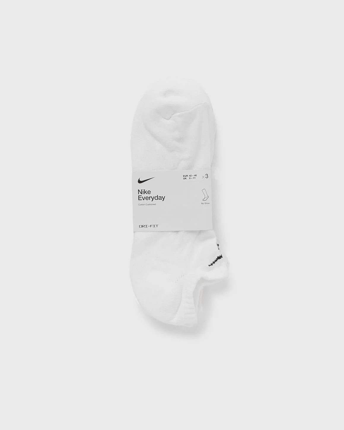 The Nike Everyday Cushioned No-Show Socks are made of ribbed cotton material with Dri-FIT technology and offer excellent breathability and a perfect fit. The cushioned terry sole provides added comfort and protection during workouts or everyday wear. - Dri-FIT technology keeps feet dry and comfortable - Thick sole provides comfort and shock absorption - Ribbed arch band ensures a supportive feel Article Number: SX7673-100 Gender: Men, Women Color: white/black Material: 88% Cotton, 7% Polyester, 5% Spandex/elastane