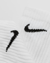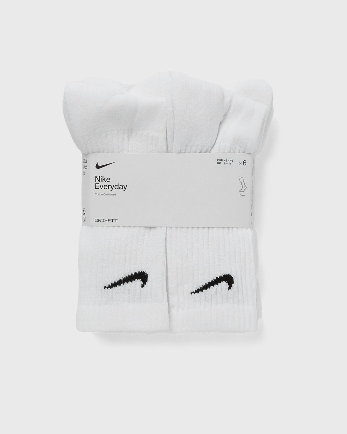 The Nike Everyday Plus Cushioned Training Crew Socks keep you comfortable during your workout with added cushioning under the heel and forefoot and a snug, supportive arch band. Dri-FIT technology provides breathability and comfort on the feet. Article Number: SX7666-100 Gender: Men, Women Color: WHITE/BLACK Material: 80% Cotton, 14% Polyester, 6% Spandex/elastane