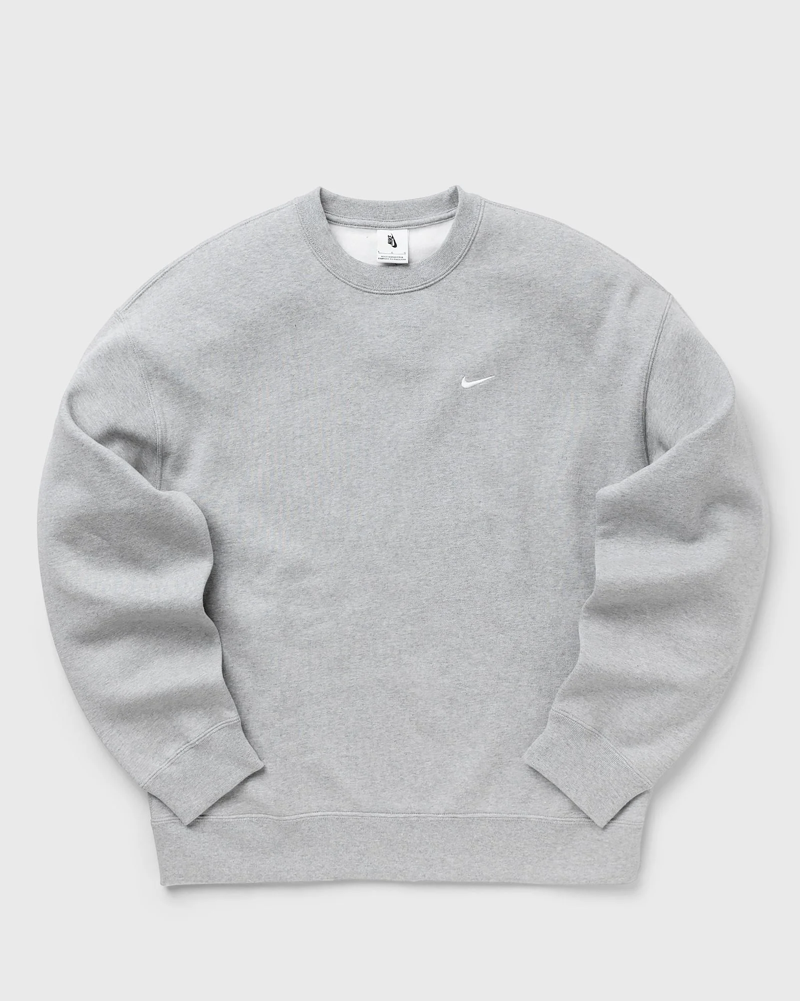 The Nike Solo Swoosh Crew Sweater is made from soft, brushed fleece for comfort. It has a roomy fit with dropped shoulders for unrestricted movement and elasticized cuffs and hem to trap heat inside. The embroidered Solo swoosh rounds off the design. - Roomy fit - Round neck - Ribbed cuffs and hem Article number: DX1361-063 Gender: men Color: DK GREY HEATHER/WHITE Material: 80% Cotton, 20% Polyester