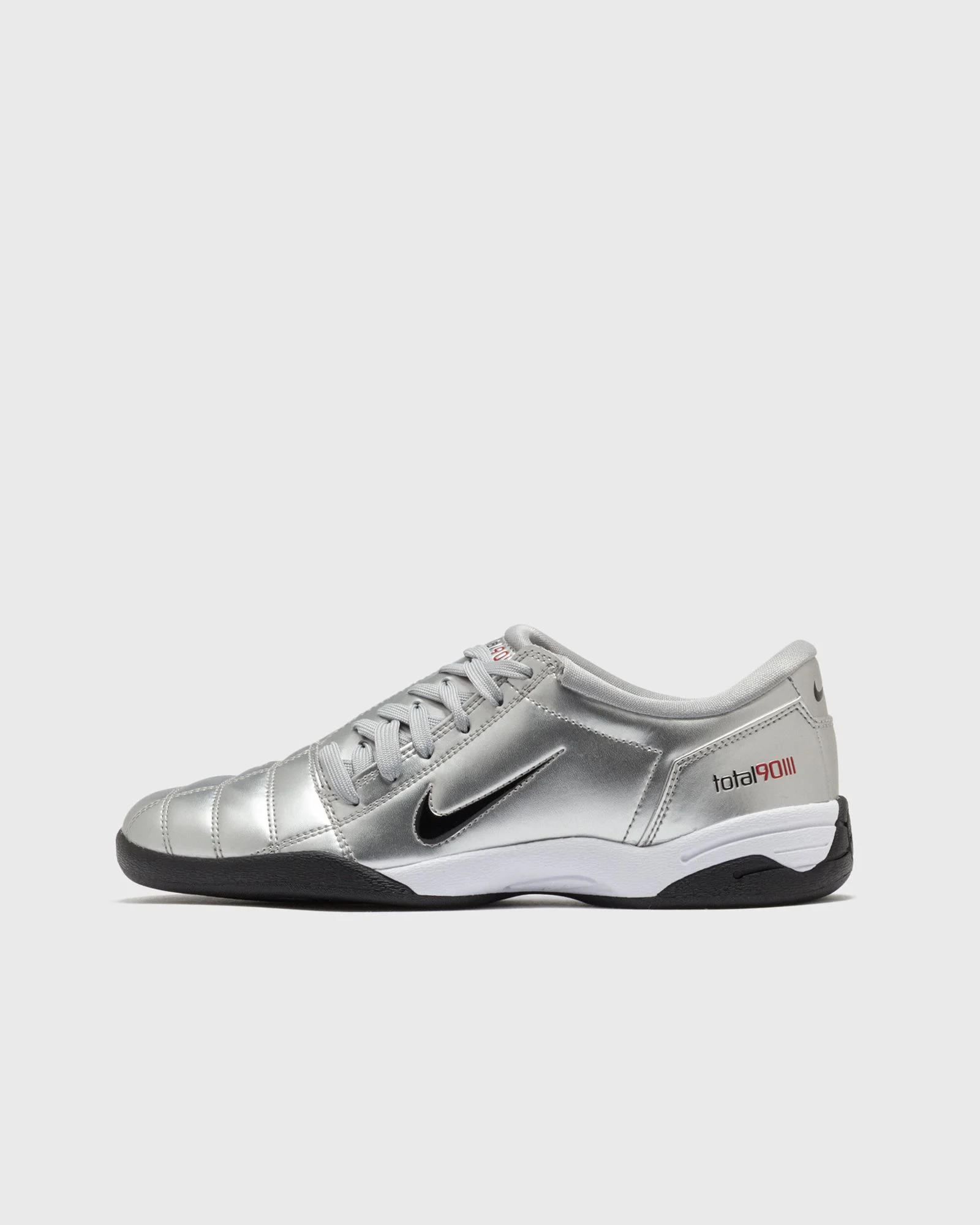 The iconic Total 90 is back—with authentic soccer style and Y2K vibes. The quilted upper and asymmetrical lacing add retro flair, while the flat rubber sole makes the shoe street-ready. - The synthetic leather upper features a Total 90 logo on each side - The rubber outsole provides grip and durability - Padded collar Article number: IM7595-001 Gender: men,women Color: METALLIC SILVER/BLACK-UNIVERSITY RE Material: 100% Synthetic/Textile