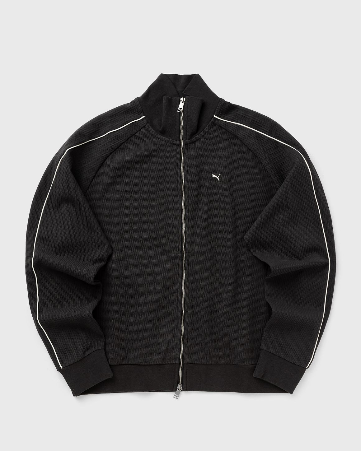 The Puma T7 tracksuit made its debut in 1968 and has been changing the game ever since. To this day, it remains a timeless streetwear basic, instantly recognizable by its classic cut, tapered side panels and Puma branding. - Pique fabric - Stand collar - Long sleeves - Two-way zip - Ribbed collar, cuffs and hem - Zipped side pockets - Signature Puma T7 (7cm) stripe Article Number: 632327-01 Gender: Men Color: Puma Black Material: 50% Cotton, 47% Polyester, 3% Spandex/elastane