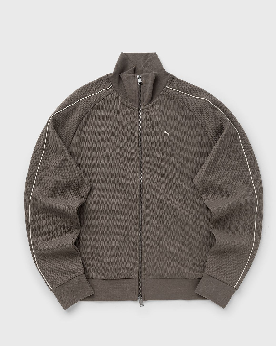 The Puma T7 tracksuit made its debut in 1968 and has been changing the game ever since. To this day, it remains a timeless streetwear basic, instantly recognizable by its classic cut, tapered side panels and Puma branding. - Pique fabric - Stand collar - Long sleeves - Two-way zip - Ribbed collar, cuffs and hem - Zipped side pockets - Signature Puma T7 (7cm) stripe Article Number: 632327-41 Gender: Men Color: FLAT BRONZE Material: 50% Cotton, 47% Polyester, 3% Spandex/elastane