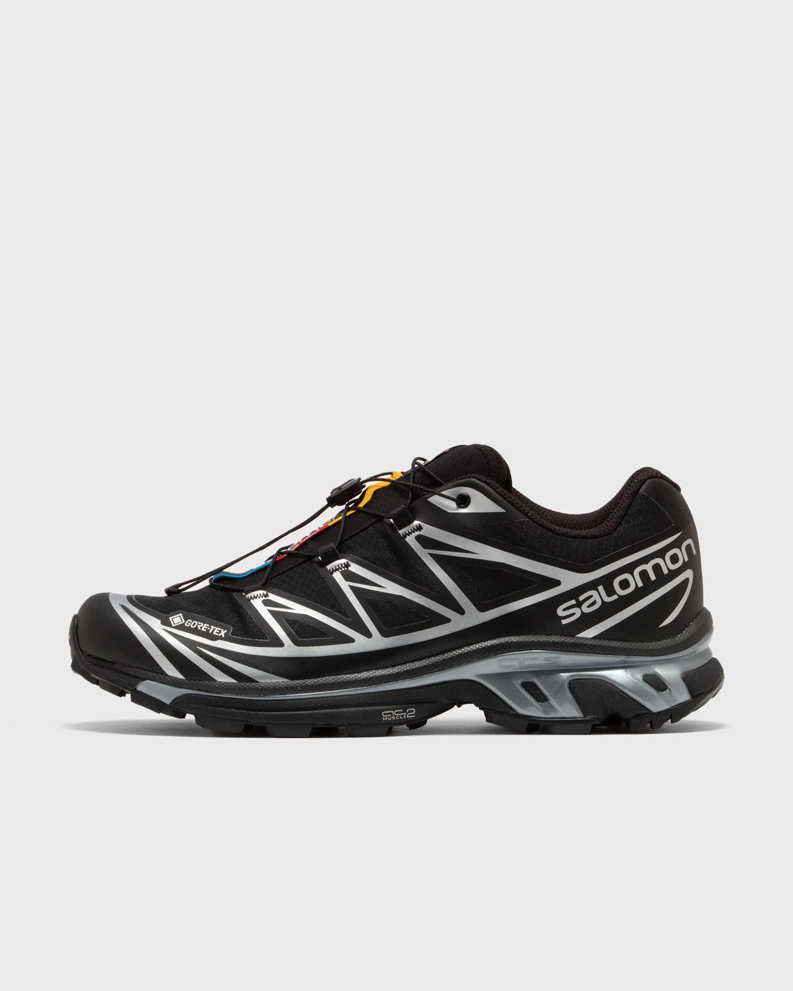The Salomon XT-6 GORE-TEX celebrates the label's trail background and defies even the most adverse weather conditions with an innovative ePE membrane, a PFC-free mesh fabric insert for debris protection and durable cushioning and stability, no matter how long the route. - Quicklace lacing system - Textile lining - Rubber outsole Article Number: L47450600 Gender: Men Color: BLACK/BLACK/FTW SILVER Material: 30% Rubber, 70% Synthetic/Textile