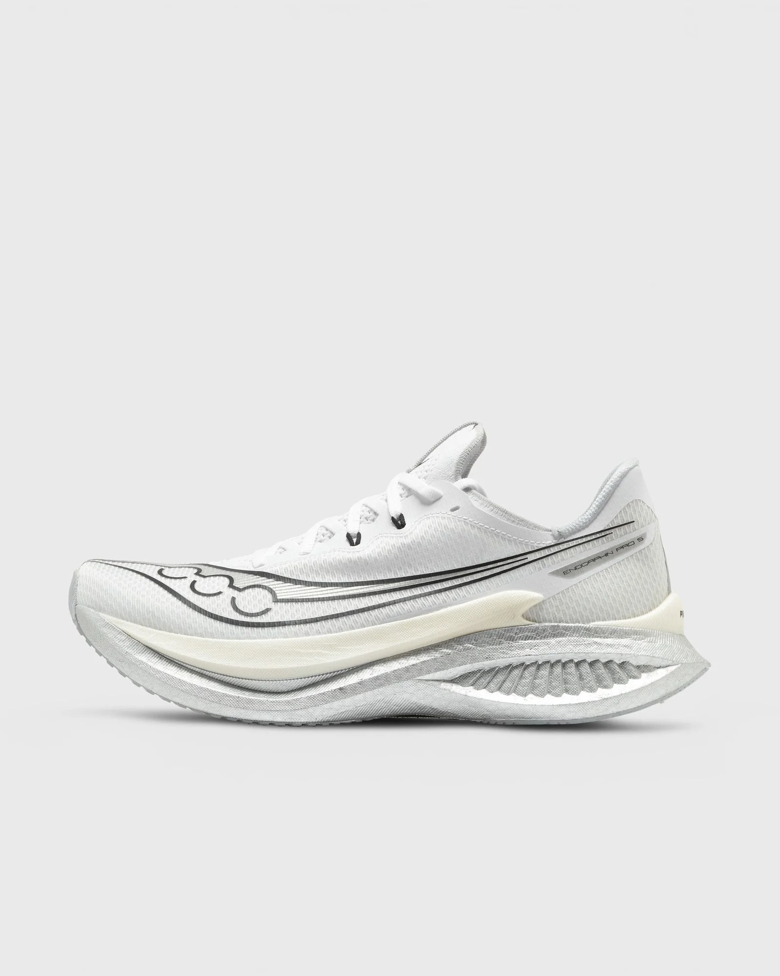The Saucony Endorphin Pro 5 is the most advanced version yet of this high-performance racing shoe—designed for maximum speed and noticeable propulsion with every step. At its core is a new dual-density system made of PWRRUN PB and Super Critical PWRRUN HG, which delivers outstanding energy return. The redesigned carbon plate with SPEEDROLL technology enables exceptionally smooth transitions and an explosive push-off. The package is rounded out by the targeted PWRTRAC outsole, which delivers reliable grip even at top speed. - Fusion midsole - Slotted carbon plate - Durable PWRTRAC rubber outsole Article number: S21064-101 Gender: men Color: WHITE/BLACK Material: 30% Rubber, 70% Synthetic/Textile