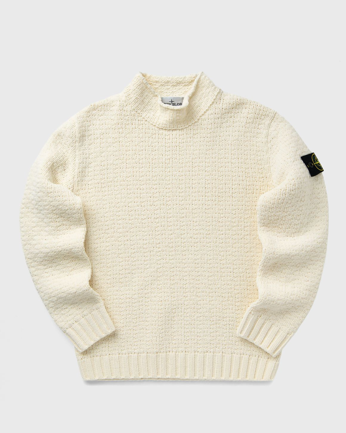 The Stone Island stand-up collar sweater is made from cotton chenille with left-knitted bands on the sleeves and back, with ribbed edging. - Gauge 3##- Ribbed neckline with stand-up collar##- Stone Island badge on the left sleeve##- Left-knitted band on the back of the sleeves and on the sides of the back##- Cuffs and waistband fully ribbed at the bottom##- Oversized fit Article Number: K2S155100019S00N5.V0093 Gender: Men Color: IVORY Material: 100% Cotton