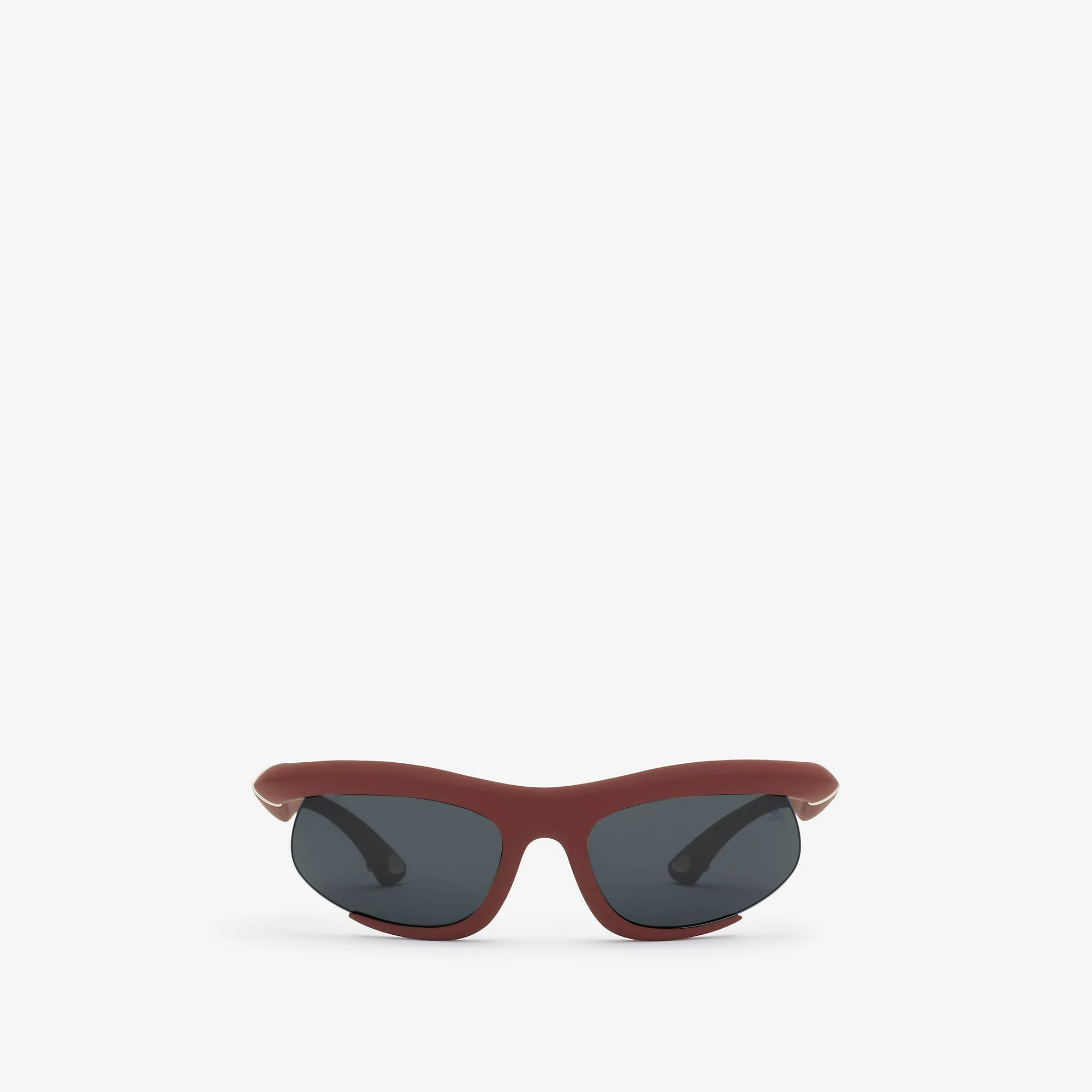 Product Details A pair of curved wrap-around sunglasses made in Italy from injected nylon. The sporty style features a metal shield at the temple tip to attach the adjustable strap. - Scratch-resistant black mirrored lenses - 100% UV protection - Detachable strap - Engraved Burberry lettering at temple - Engraved Equestrian Knight Design on lens - Comes with a hard leather case and cleaning cloth - Item 40844341 Size & Fit - Frame width: 15.3cm/6in. Frame height: 4.6cm/1.8in Fabric & Care - Frame: 100% nylon* - Trim: 100% metal - *The bio-nylon used for the frames contains at least 45% bio-based content derived from plant-based renewable resources - Made in Italy