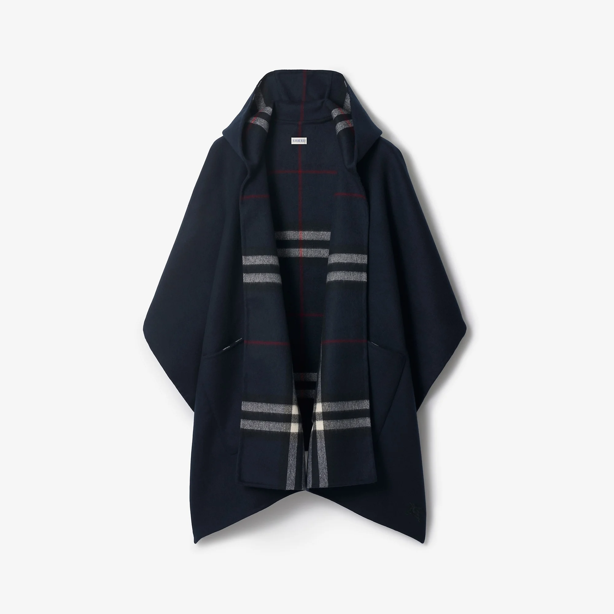 Product Details A hooded cape in cashmere, embroidered with a tonal Equestrian Knight Design. Made at a Scottish mill founded in 1797, the fabric is washed in local spring water and brushed for a soft finish. The inner is woven with Burberry Check. - Side patch pockets - Burberry Check inner - Embroidered Equestrian Knight Design at hem - Item 81152631 Size & Fit - 176 x 120cm/69.3 x 47.2in Fabric & Care - 100% cashmere - Specialist dry clean - Made in Scotland