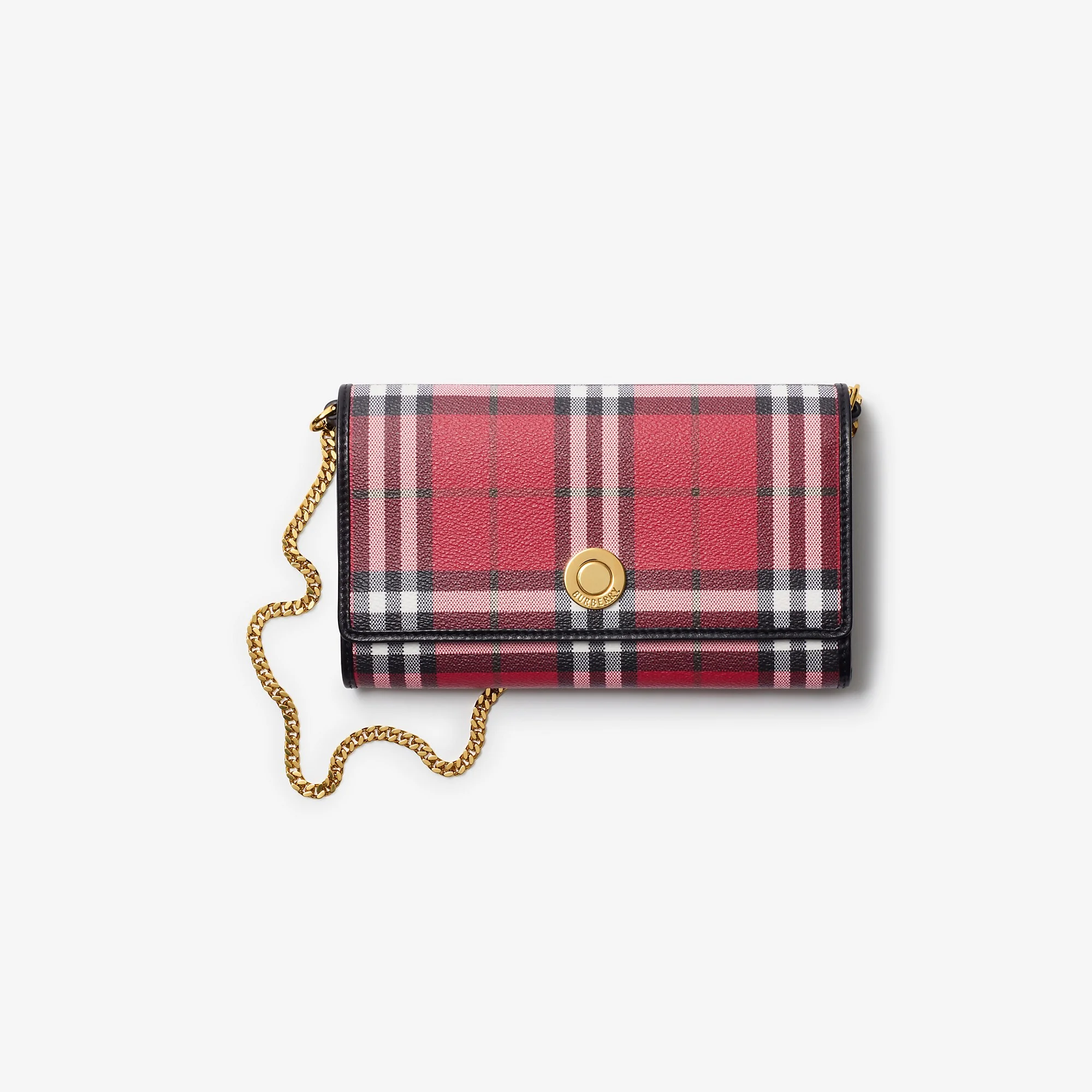 Product Details A chain strap wallet in a coated cotton blend, printed with the Burberry Check in seasonal post red and lined in a contrasting colour. The special-edition design is trimmed with smooth calf leather and detailed with a logo-engraved press stud. - Chain strap - Foldover flap with press-stud closure - 12 card slots - Interior zip compartment, two interior compartments, two interior slip pockets - Hand-painted edges - Brushed metal hardware - Lined - Comes with a dust bag - Item 81169421 Size & Fit - 20.5 x 3.5 x 12cm/8.1 x 1.4 x 4.7in. Strap drop: 55cm/21.7in Fabric & Care - Outer: 53% cotton, 47% polyurethane - Trim: 100% calf leather - Linings: 100% viscose; 100% polyamide - Imported