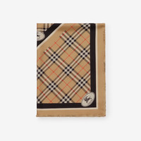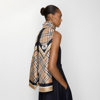 Product Details A rectangular scarf made in Italy from silk twill, woven with the Burberry Check. The design is framed with contrasting stripes and our Knight stamp, an archival motif first seen on Burberry bags in the 1980s. - Rectangular - Eyelash fringing at edges - Woven Burberry lettering at corners - Item 81142251 Size & Fit - 200 x 70cm/78.7 x 27.6in Fabric & Care - 100% silk - Specialist dry clean - Made in Italy