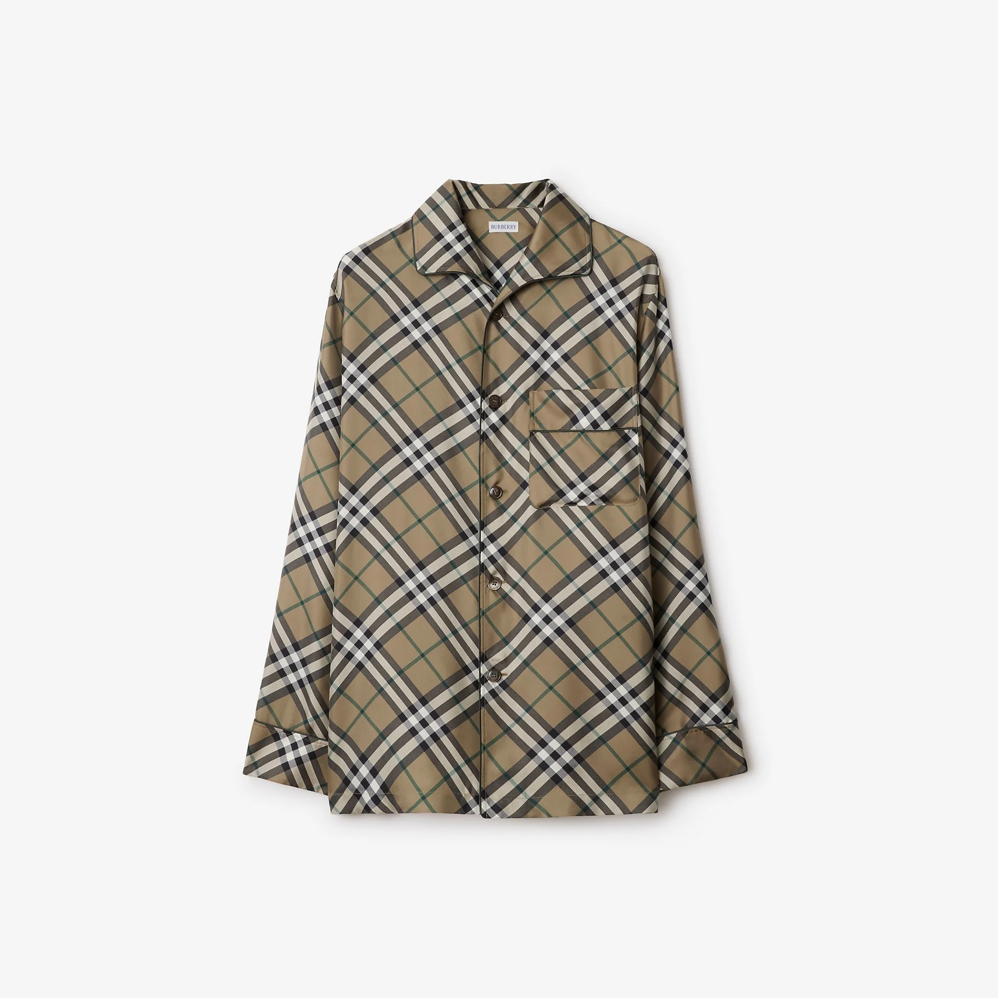 Product Details A pyjama shirt made in Italy from silk twill, printed with the Burberry Check. Debuted on the Burberry Winter 2025 runway, the style is tailored to an oversized fit and trimmed with green piping. - Button closure - Spread collar - Chest patch pocket - Straight hem - Oversized fit: our loosest cut, designed for exaggerated proportions. Consider taking a size down. - Item 81167501 Size & Fit - Length: 79cm/31.1in (size UK L) - Model’s height: 185cm/6ft 1in. Model wears size UK L Fabric & Care - 100% silk - Buttons: mother-of-pearl - Specialist dry clean - Made in Italy