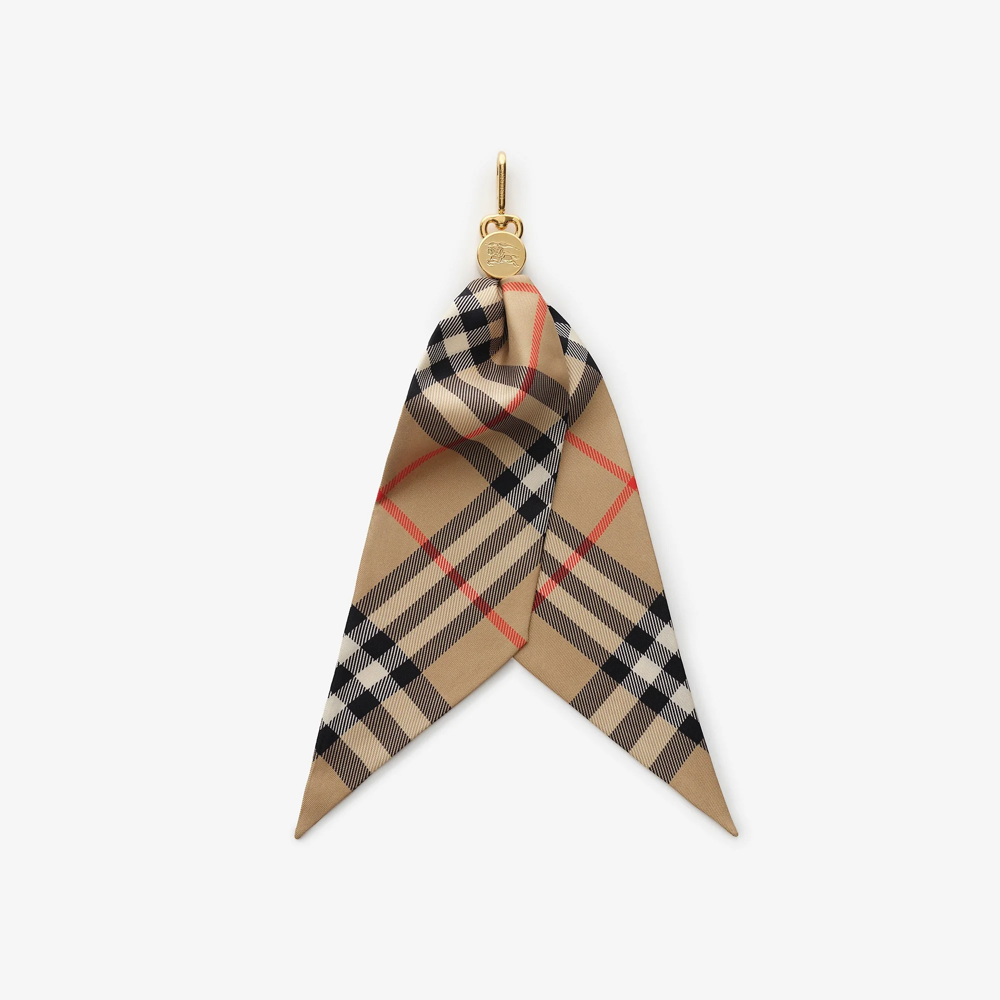 Product Details The signature Burberry scarf is reimagined as a charm, crafted in Italy from silk woven with the Burberry Check in signature sand beige. The gold-tone hardware is engraved with our logo and Equestrian Knight Design. Attach to a bag, belt or keys for a pop of our iconic house code. - Item 81241531 Size & Fit - 35cm/13.8in tall Fabric & Care - 100% silk - Made in Italy