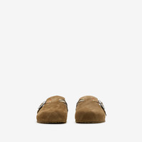 Product Details A pair of clogs crafted in Italy from soft suede embossed with a check pattern, set on a grooved sole moulded with archive Burberry lettering. The design is finished with an adjustable B buckle strap, jacquard-woven with the Burberry Check in our signature sand colourway. - Rounded toe - Burberry lettering at sole - Comes with a dust bag - Item 81133931 Fabric & Care - Upper: 90% calf suede, 6% polyamide, 4% polyester - Trim: 97% zinc alloy, 3% brass - Lining: 40% leather, 40% polyester, 20% polyurethane - Sole: 100% thermoplastic polyurethane - Made in Italy