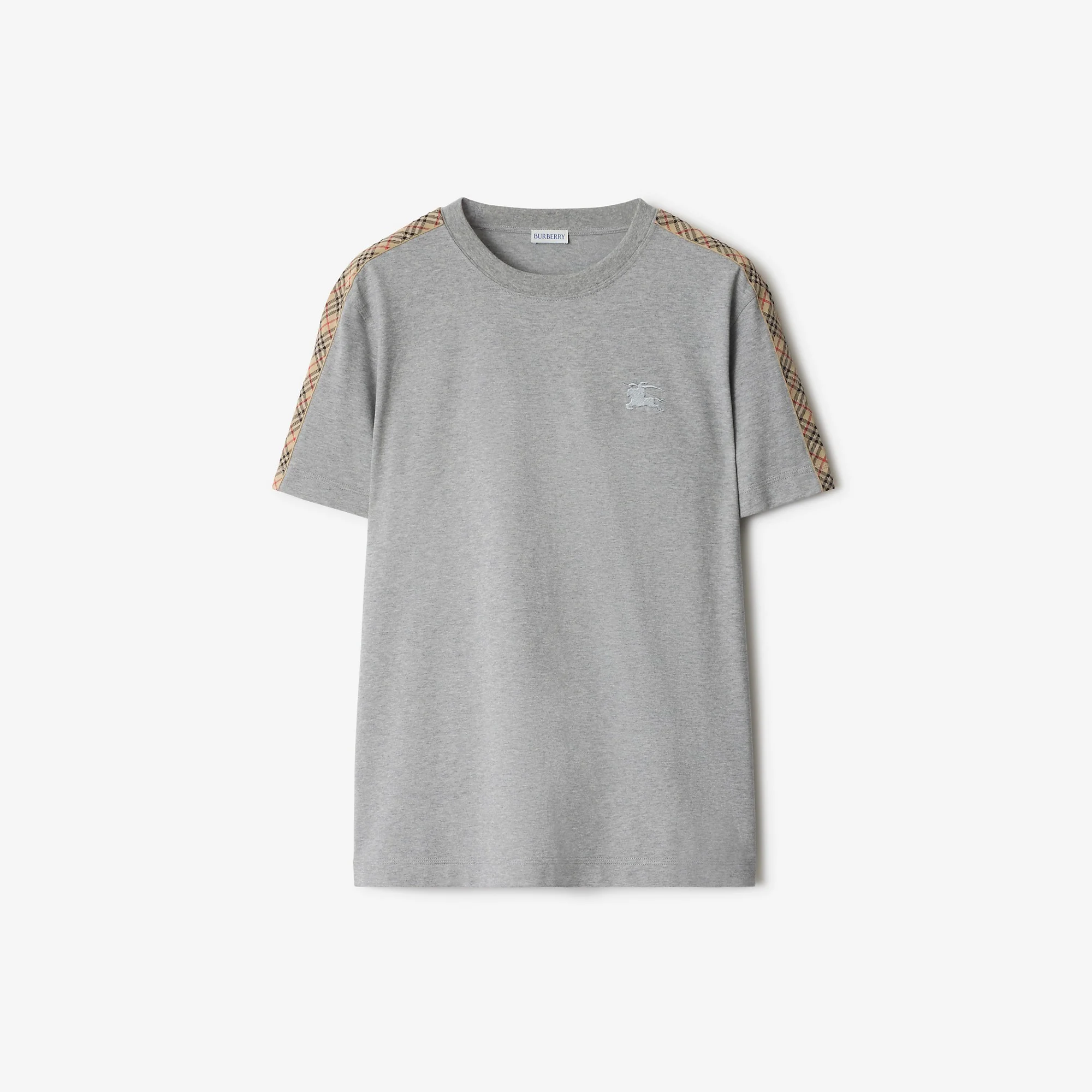 Product Details A T-shirt in lightweight cotton jersey, cut to a slim fit. The style is embroidered with the Equestrian Knight Design and framed with Burberry Check taping at the sleeves. - Rib-knit neckline - Embroidered Equestrian Knight Design at chest - Slim fit: this style is cut to a fitted silhouette. Fits true to size, take your normal size. - Machine wash - Item 81187081 Size & Fit - Length: 73cm/28.7in (size UK L) - Model’s height: 188cm/6ft 2in. Model wears size UK L Fabric & Care - 100% cotton - Trims: 100% polyester; 98% cotton, 2% elastane - Made in Portugal