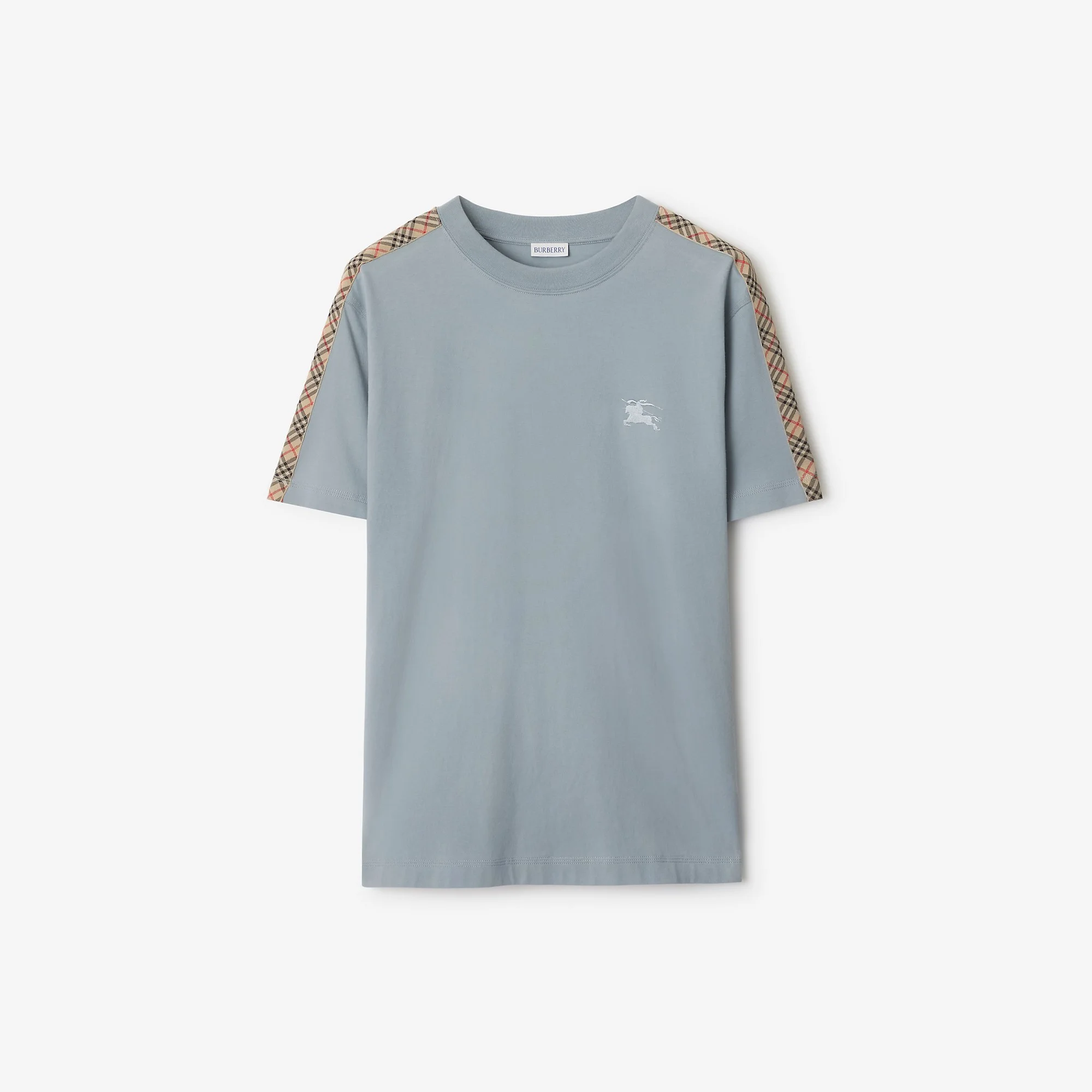 Product Details A T-shirt in lightweight cotton jersey, cut to a slim fit. The style is embroidered with the Equestrian Knight Design and framed with Burberry Check taping at the sleeves. - Rib-knit neckline - Embroidered Equestrian Knight Design at chest - Slim fit: this style is cut to a fitted silhouette. Fits true to size, take your normal size. - Machine wash - Item 81105761 Size & Fit - Length: 73cm/28.7in (size UK L) Fabric & Care - 100% cotton - Trim: 98% cotton, 2% elastane - Imported