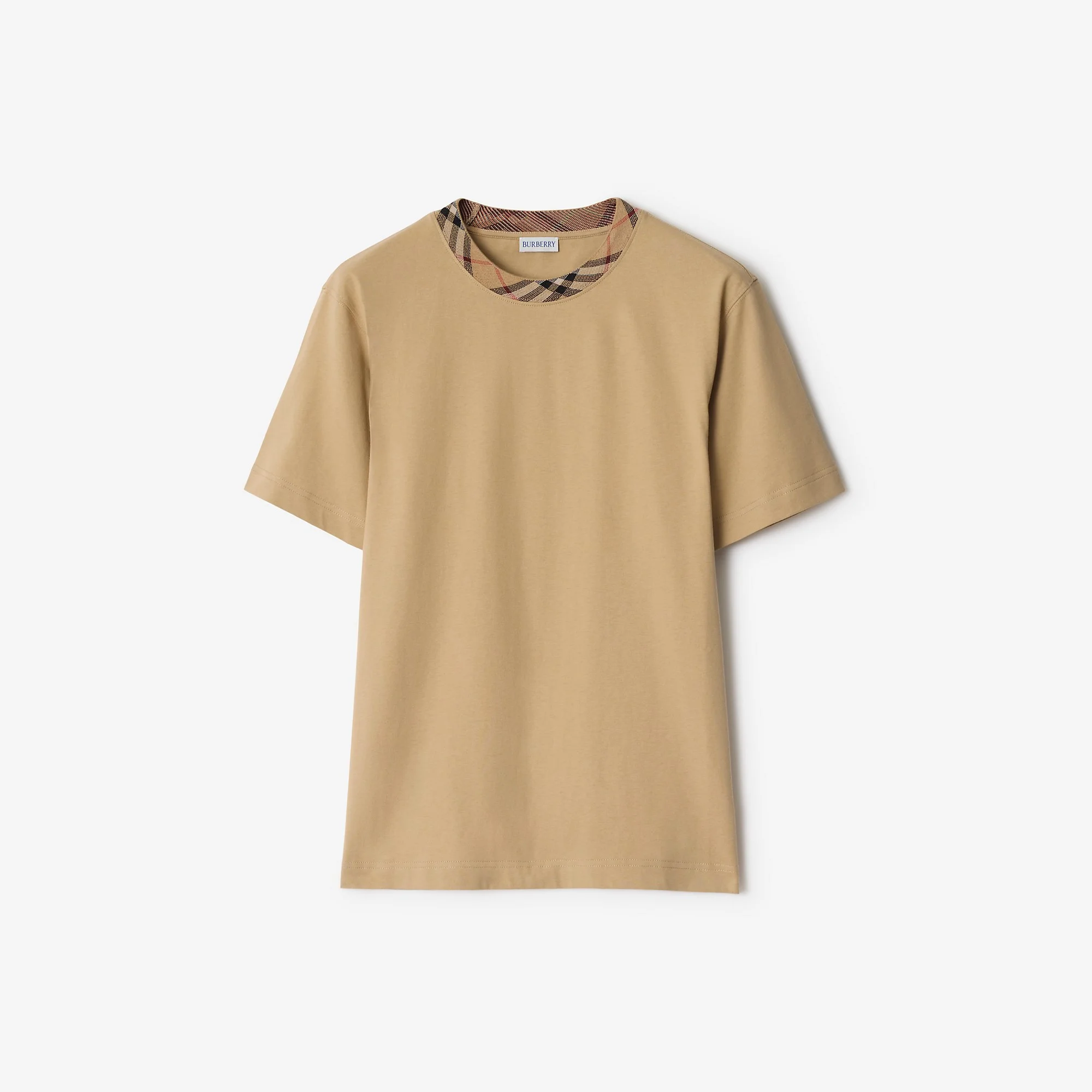 Product Details A crew-neck T-shirt in cotton jersey, cut to a relaxed fit. The design is detailed with Burberry Check taping in our signature sand beige colourway. - Rib-knit neckline - Relaxed fit: a looser cut than our regular fit. - Machine wash - Item 81128031 Size & Fit - Length: 72.5cm/28.5in (size UK M) - Model's height: 190cm/6ft 3in. Model wears size UK M Fabric & Care - 100% cotton* - Trim: 91% cotton, 7% polyamide, 2% elastane - *The main material of this product contains at least 70% cotton, all of which is organically grown - Made in Portugal