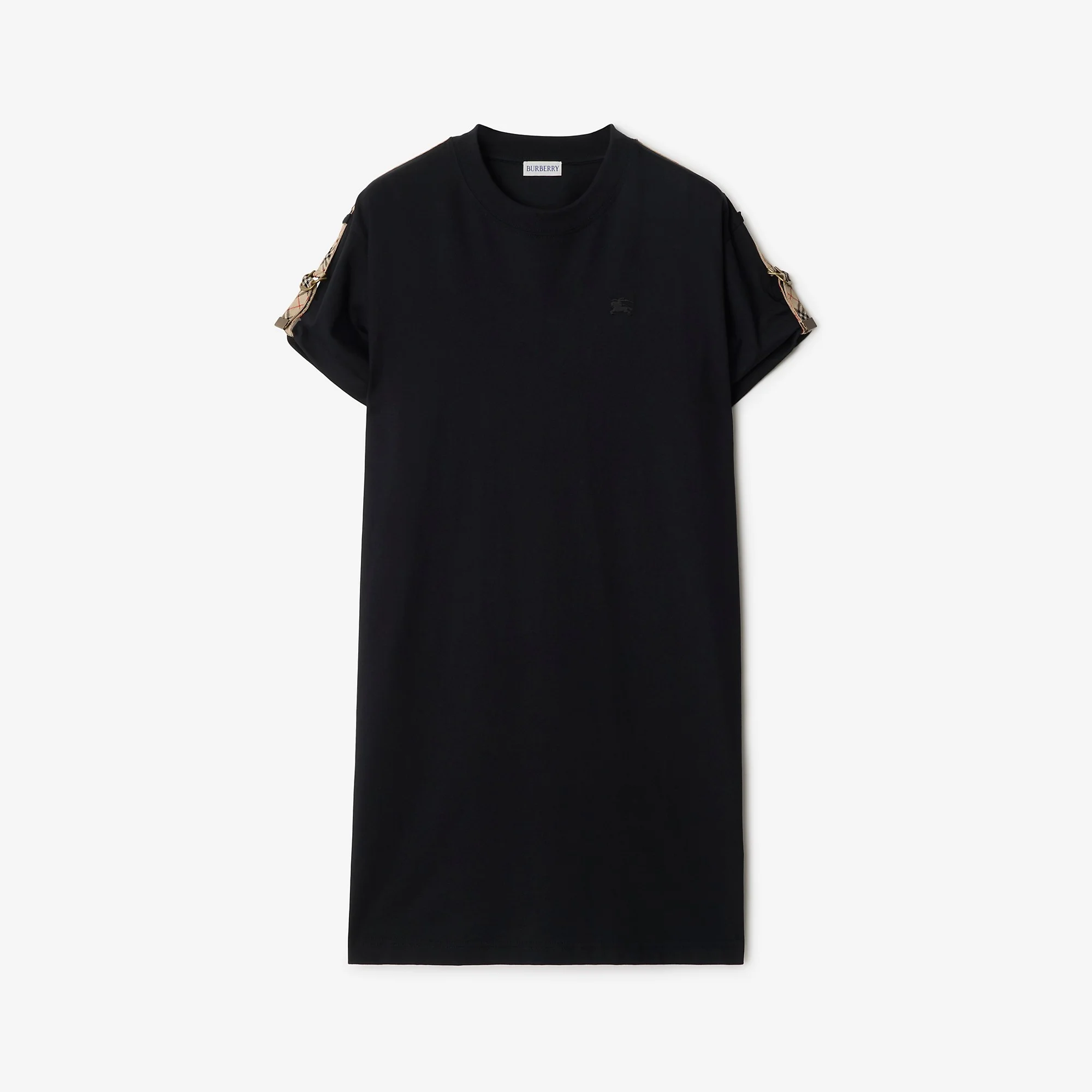 Product Details A T-shirt dress in lightweight cotton jersey, cut to a relaxed fit and embroidered with a tonal Equestrian Knight Design. The sleeves can be adjusted with the Burberry Check straps and B buckles. - Rib-knit neckline - Embroidered Equestrian Knight Design at chest - Relaxed fit: a looser cut than our regular fit. - Machine wash - Item 81100811 Size & Fit - Length: 88cm/34.7in (size UK S) - Model’s height: 177cm/5ft 10in. Model wears size UK S Fabric & Care - 100% cotton - Trims: 97% cotton, 3% elastane; 100% polyester - Made in Portugal