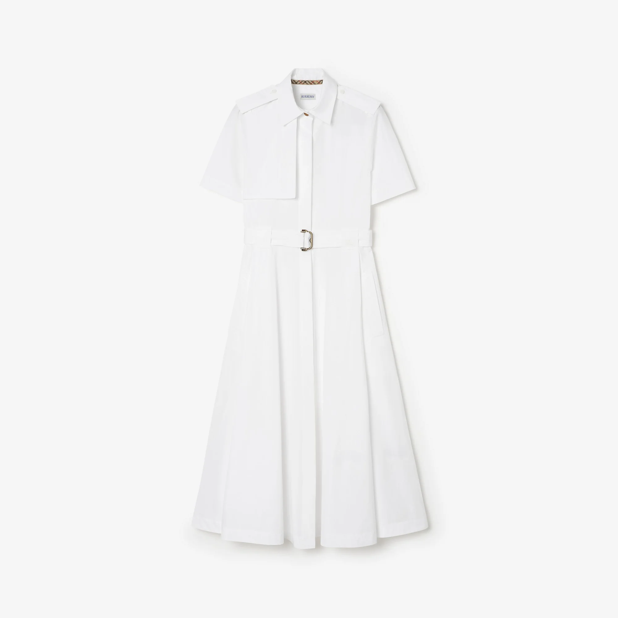 Product Details An elegant shirt dress in summery optic white cotton poplin. The A-line silhouette is detailed with epaulettes and a gun flap, inspired by our signature trench. Use the B buckle belt to adjust the fit. - Item 81232491 Size & Fit - Length: 120cm/47.2in (size UK 8) - Model’s height: 178cm/5ft 10in. Model wears size UK 8 Fabric & Care - 100% cotton - Pocket lining: 100% cotton - Buttons: mother-of-pearl - Specialist dry clean - Imported