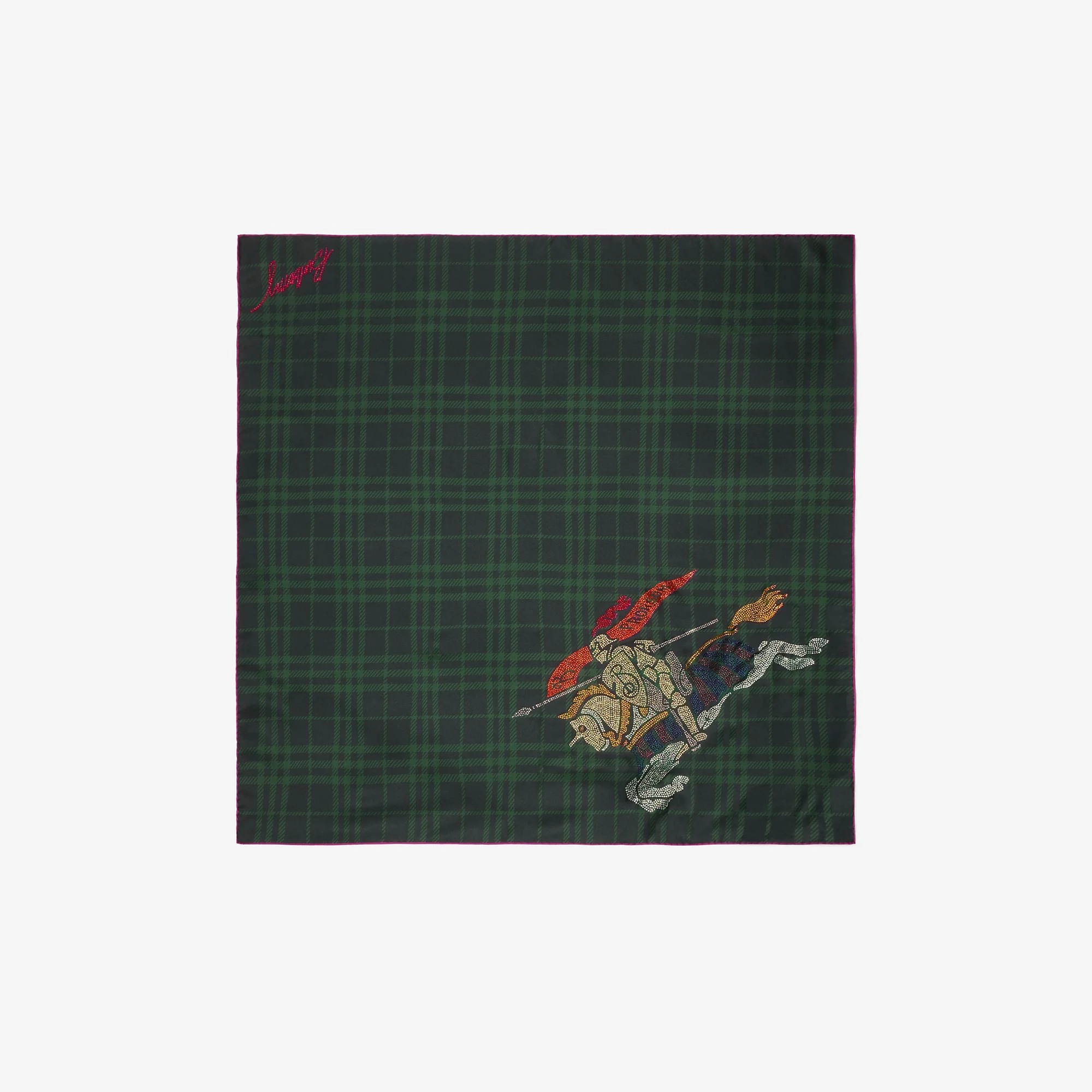 Product Details A scarf made in Italy from silk twill, printed with the Burberry Check in tonal brigade green. The design is embellished with a colourful take on our Equestrian Knight Design and a cursive logo, using over 7,000 crystals. - Square - Hand-rolled edges - Item 81138941 Size & Fit - 90 x 90cm/35.4 x 35.4in Fabric & Care - 100% silk - Specialist dry clean - Made in Italy
