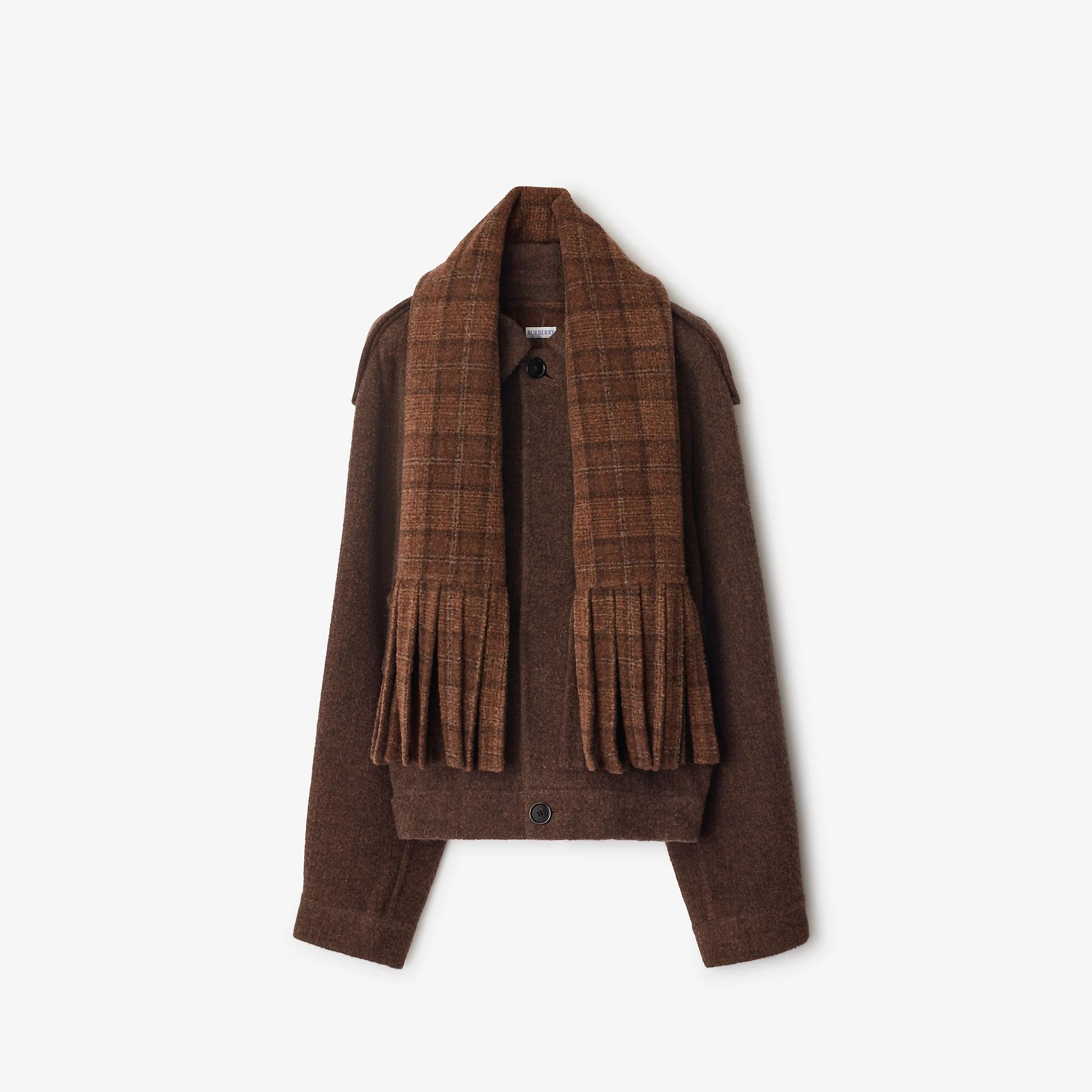 Product Details A jacket made in Italy from a double-faced llama hair and wool blend. Debuted on the Burberry Winter 2025 runway, the style features epaulettes inspired by our signature outerwear and a detachable check scarf with chunky fringing. Cut to a regular fit with buckled side straps to adjust the silhouette. - Button closure - Epaulettes - Side button welt pockets - Side adjustors - Adjustable buttoned cuffs - Unlined - Comes with a garment bag - Regular fit. Fits true to size, take your normal size. - Item 81144121 Size & Fit - Length: 65cm/25.6in (size IT 50) - Model’s height: 184cm/6ft. Model wears size IT 50 Fabric & Care - 77% llama hair, 20% polyamide, 3% wool - Buttons: buffalo horn - Buckles: 100% calf leather - Specialist dry clean - Made in Italy