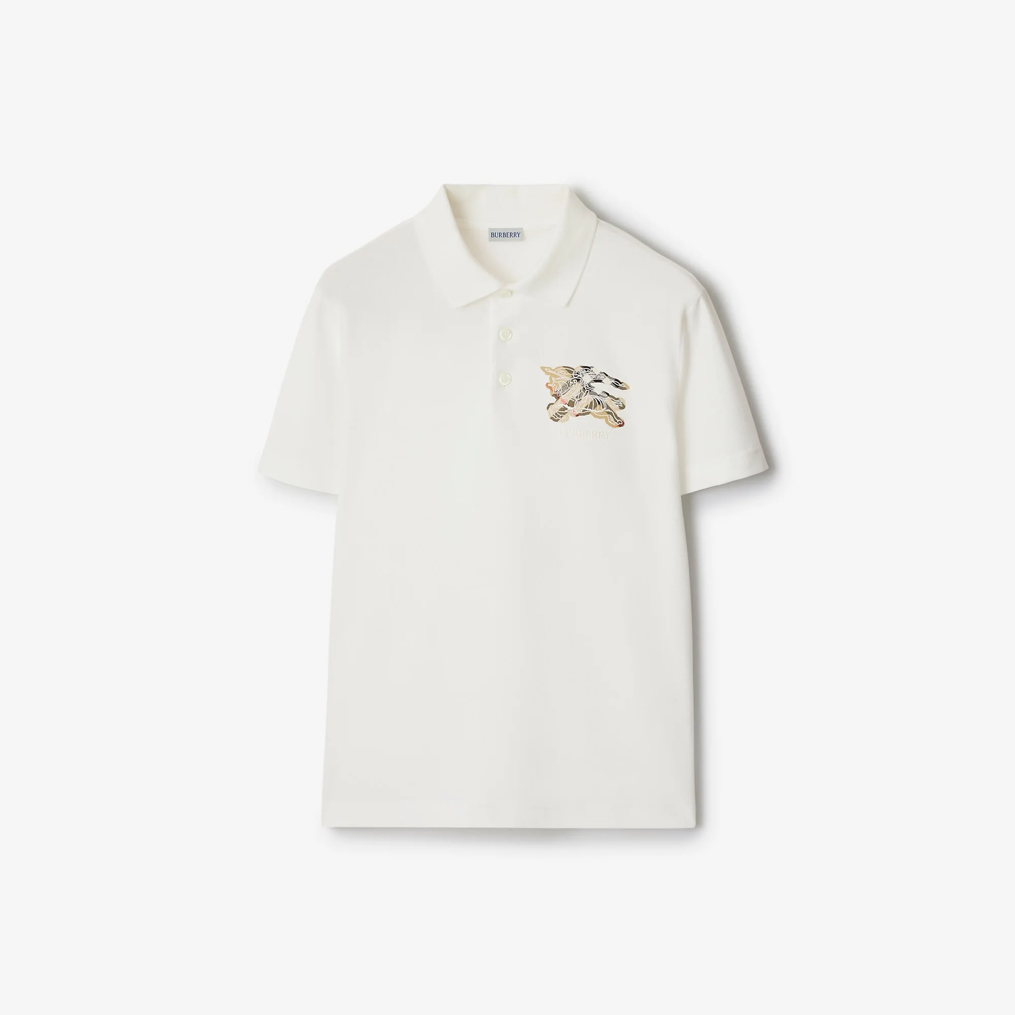 Product Details A polo shirt in lightweight cotton pique, cut for a slim fit. The style is embroidered with our logo and Equestrian Knight Design on a Burberry Check backdrop in signature sand beige. - Button placket - Rib-knit collar - Embroidered Burberry lettering at chest - Slim fit: this style is cut to a fitted silhouette. Fits true to size, take your normal size. - Machine wash - Item 81161181 Size & Fit - Length: 71.5cm/28.2in (size UK L) - Model’s height: 188cm/6ft 2in. Model wears size UK L Fabric & Care - 100% cotton - Trims: 97% cotton, 3% elastane; 100% cotton - Buttons: mother-of-pearl - Made in Portugal