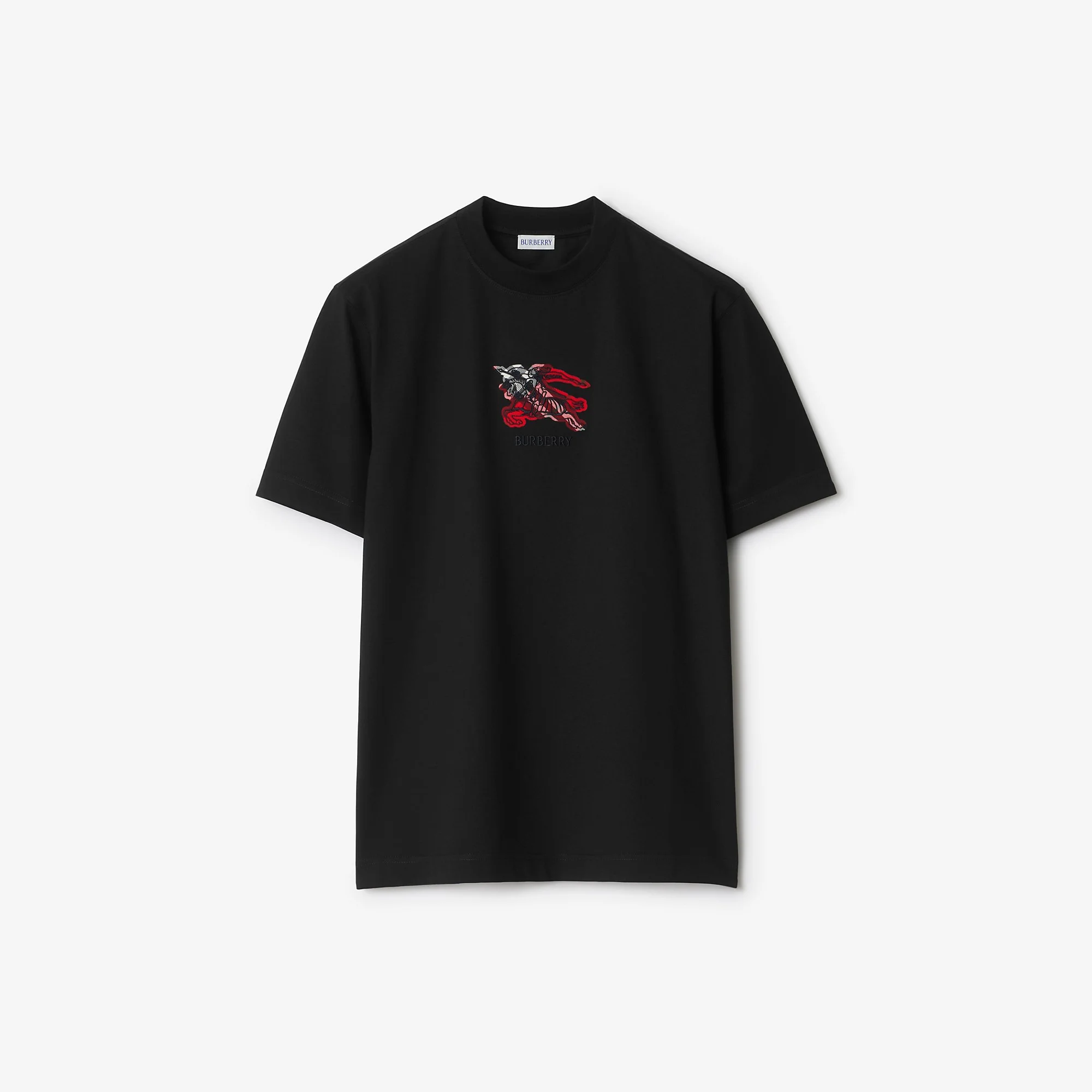 Product Details A T-shirt in lightweight cotton jersey, cut to a slim fit. The style is embroidered with our logo and Equestrian Knight Design on a Burberry Check backdrop in a seasonal post red colourway. - Rib-knit neckline - Embroidered Burberry lettering at front - Slim fit: this style is cut to a fitted silhouette. Fits true to size, take your normal size. - Machine wash - Item 81164461 Size & Fit - Length: 71.5cm/28.2in (size UK M) - Model’s height: 185cm/6ft 1in. Model wears size UK M Fabric & Care - 100% cotton - Trims: 97% cotton, 3% elastane; 100% cotton - Made in Portugal