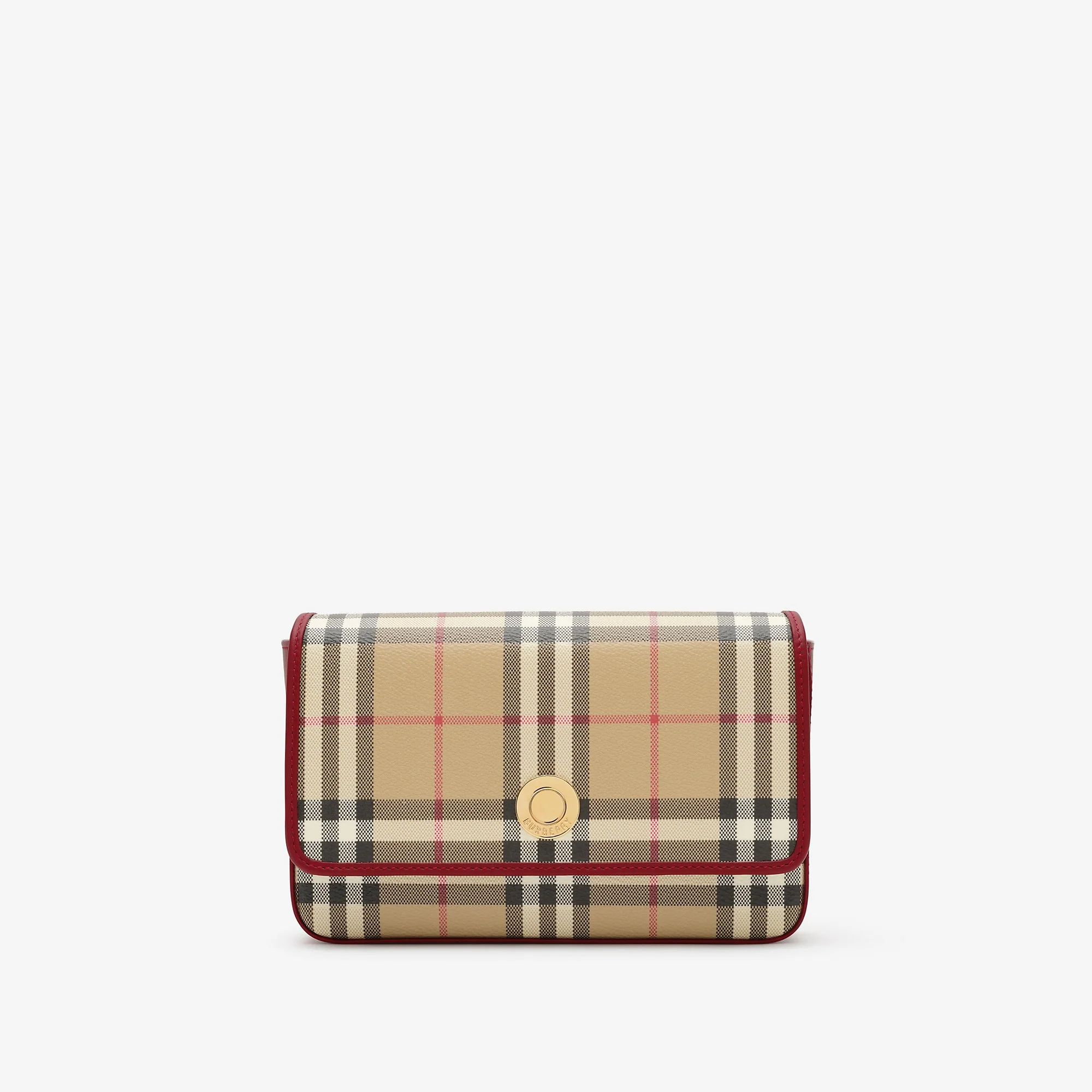 Product Details A compact bag made from a coated cotton blend, printed with the Burberry Check and lined in cotton. The design is trimmed with topstitched calf leather in seasonal ruby red and has a logo-engraved closure. Detach the strap to switch from a crossbody bag to a clutch. - Detachable, adjustable leather strap - Foldover flap with magnetic closure - Interior slip pocket - Hand-painted edges - Polished metal hardware - Cotton lining - Comes with a dust bag - Item 81163161 Size & Fit - 20.5 x 4.5 x 13cm/8.1 x 1.8 x 5.1in. Min. strap drop: 49cm/19.3in. Max. strap drop: 56cm/22.1in Fabric & Care - Outer: 55% polyurethane, 25% polyester, 20% cotton - Trim: 100% calf leather - Linings: 100% cotton; 100% polyamide - Imported
