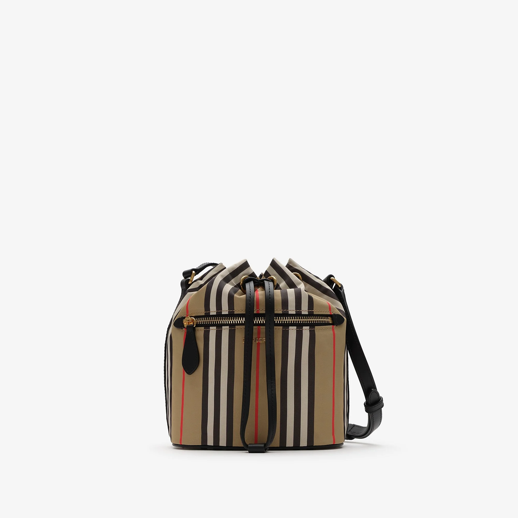 Product Details A drawstring pouch in nylon, jacquard-woven with our Icon stripe house code. The design features an adjustable leather strap, front zip pocket and logo lettering. - Item 81214661 Size & Fit - 18 x 12.5 x 22cm/7.1 x 4.9 x 8.7in #Min. strap drop: 51cm/20.1in #Max. strap drop: 57cm/22.4in Fabric & Care - Outer: 100% polyamide - Trim: 100% leather - Lining: 100% polyamide - Imported