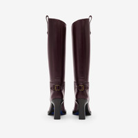 Product Details Grounded in our heritage of outdoor pursuits, the Cavalier boots are made in Italy from smooth calf leather. The knee-high, column silhouette features pull tabs and buckled ankle straps – inspired by equestrian styles and reworked with a heel. Our Equestrian Knight Design is moulded at the sole in signature Knight Blue. - Rounded toe - Equestrian Knight Design at sole - Engraved Burberry lettering at buckle - Comes with a dust bag - Item 81144031 Size & Fit - Heel height: 8.5cm/3.4in. Length from top of heel to top of boot: 38cm/15in. Top circumference: 36.5cm/14.4in Fabric & Care - Upper: 100% calf leather - Trim: 50% copper, 50% zinc alloy - Lining: 90% calf leather, 6% polyester, 4% polyurethane - Sole: 90% calf leather, 6% thermoplastic polyurethane, 4% ABS - Made in Italy