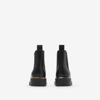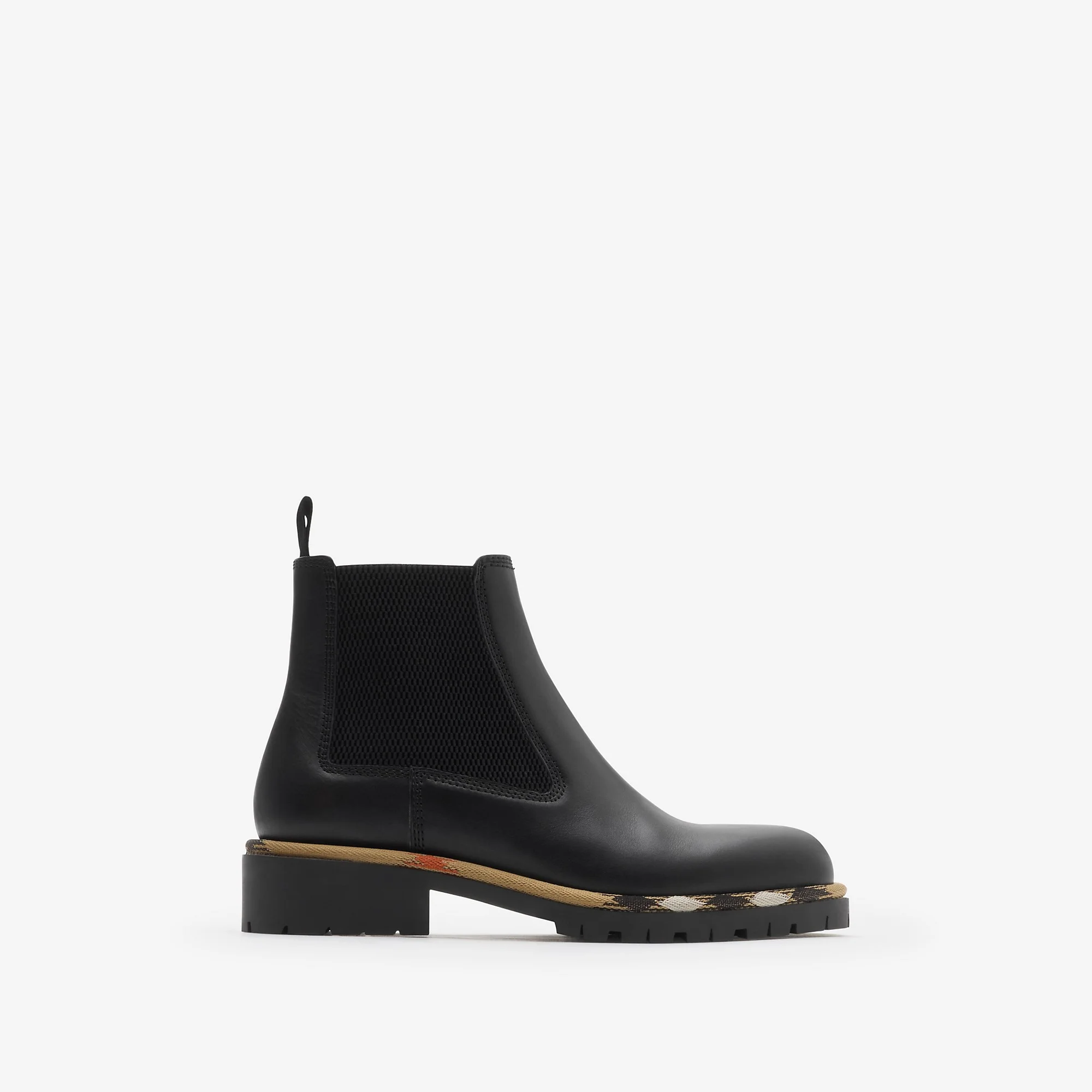 Product Details Italian-made Chelsea boots in calf leather, set on a lightweight sole and finished with pull tabs. The design features a contrast webbing trim, jacquard-woven with the Burberry Check in our signature sand colourway. - Rounded toe - Burberry Check insole - Equestrian Knight Design at sole - Comes with a dust bag - Item 81117441 Size & Fit - Heel height: 3.5cm/1.4in. Length from top of heel to top of boot: 12cm/4.7in. Top circumference: 22cm/8.7in Fabric & Care - Upper: 70% calf leather, 19% polyester, 11% rubber - Lining: 65% calf leather, 22% polyester, 11% rubber, 2% polyurethane - Sole: 90% thermoplastic polyurethane, 9% polyamide, 1% polyester - Made in Italy