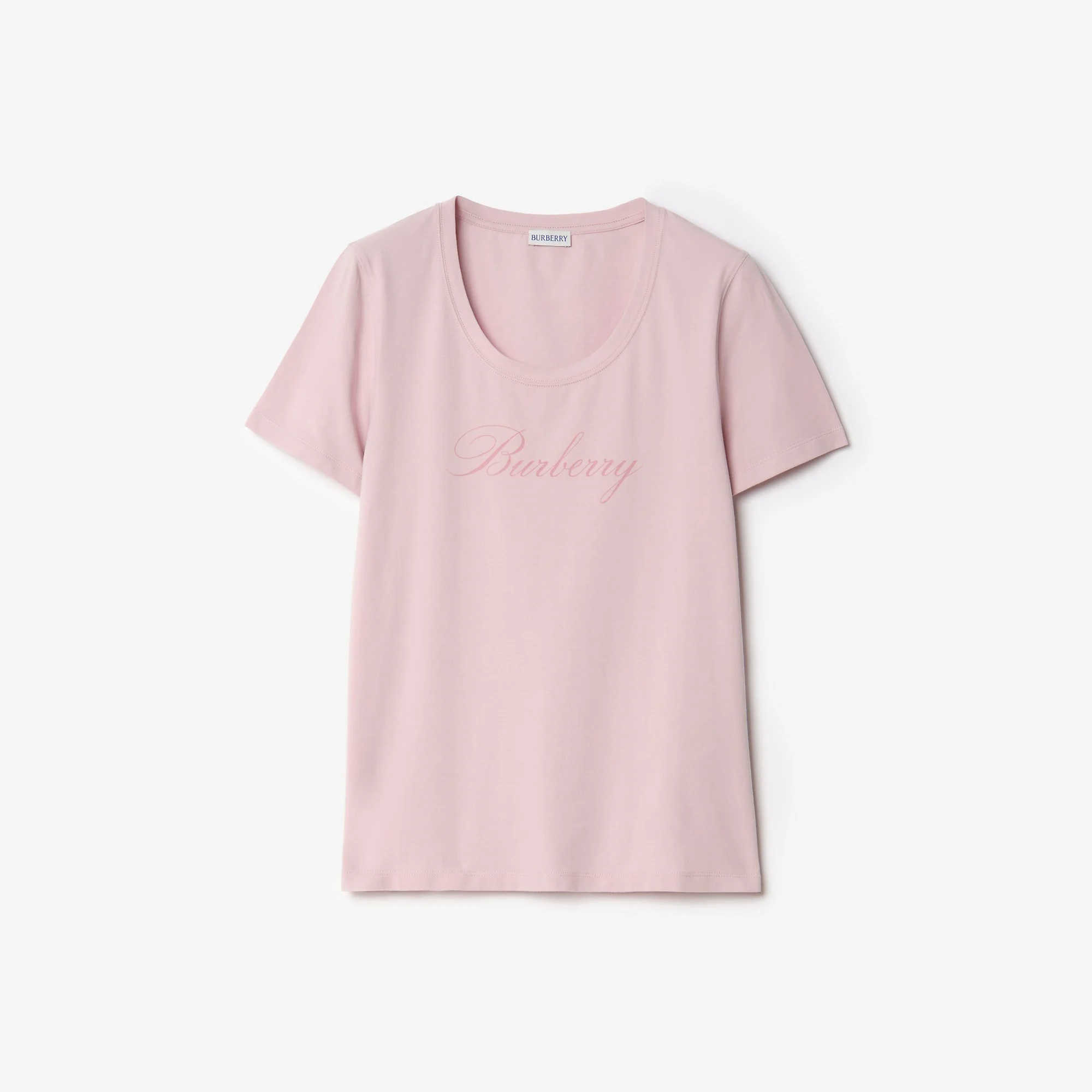 Product Details Slim fit: this style is cut to a fitted silhouette. Fits true to size, take your normal size. A scoop neck T-shirt in stretch cotton, cut to a slim fit and printed with a cursive logo. - Rib-knit neckline - Printed Burberry lettering at chest - Machine wash - Item 81209941 Size & Fit - Slim fit: this style is cut to a fitted silhouette. Fits true to size, take your normal size. - Length: 63cm/24.8in (size UK S) Fabric & Care - 96% cotton, 4% elastane - Imported