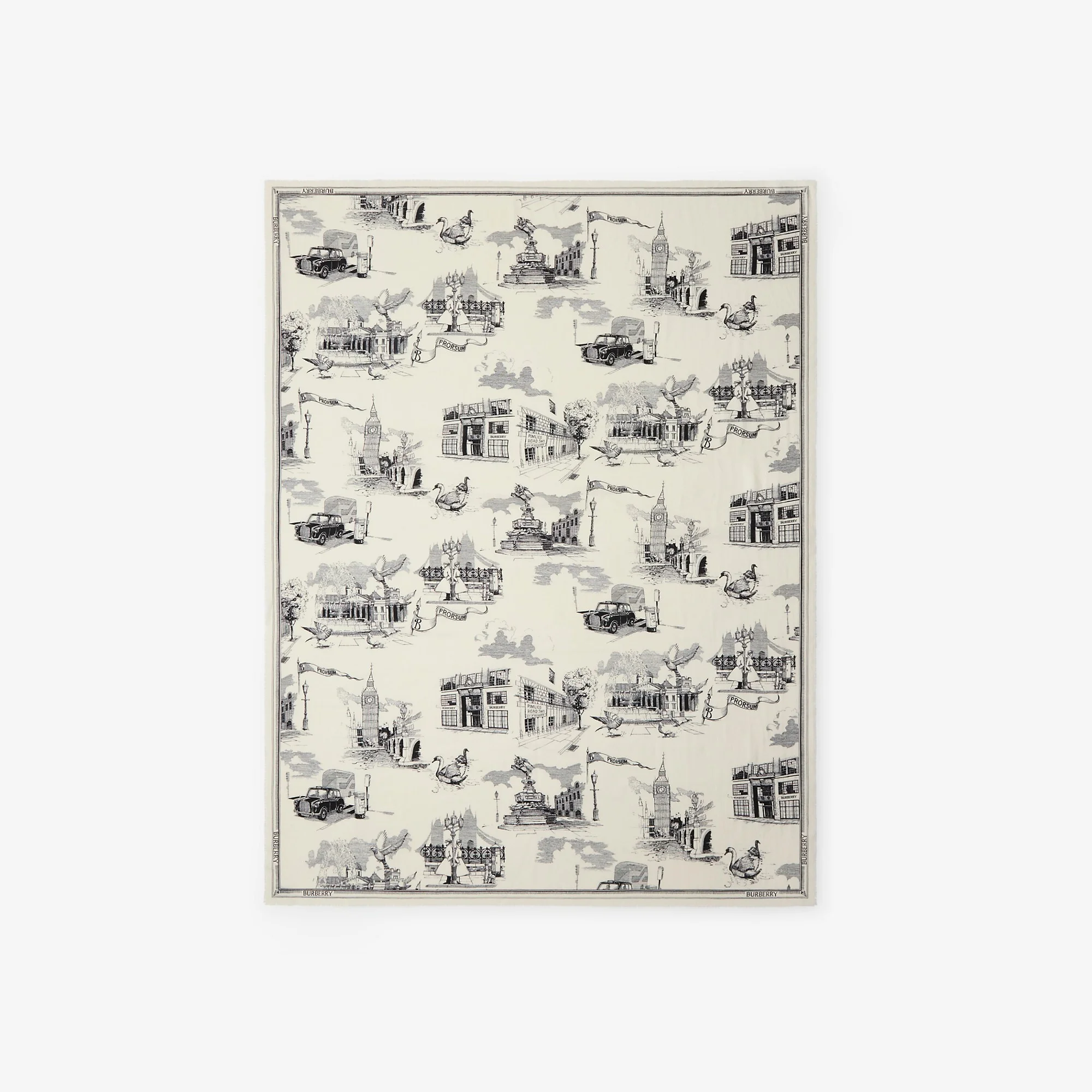Product Details A lightweight scarf made in Italy from wool silk. The design is printed with hand-drawn artwork depicting iconic London landmarks including the Houses of Parliament, Tower Bridge, Trafalgar Square and our Horseferry House headquarters. - Rectangular - Eyelash fringing at edges - Printed Burberry lettering at border - Item 81112511 Size & Fit - 195 x 135cm/76.8 x 53.2in Fabric & Care - 50% wool, 50% silk - Specialist dry clean - Made in Italy