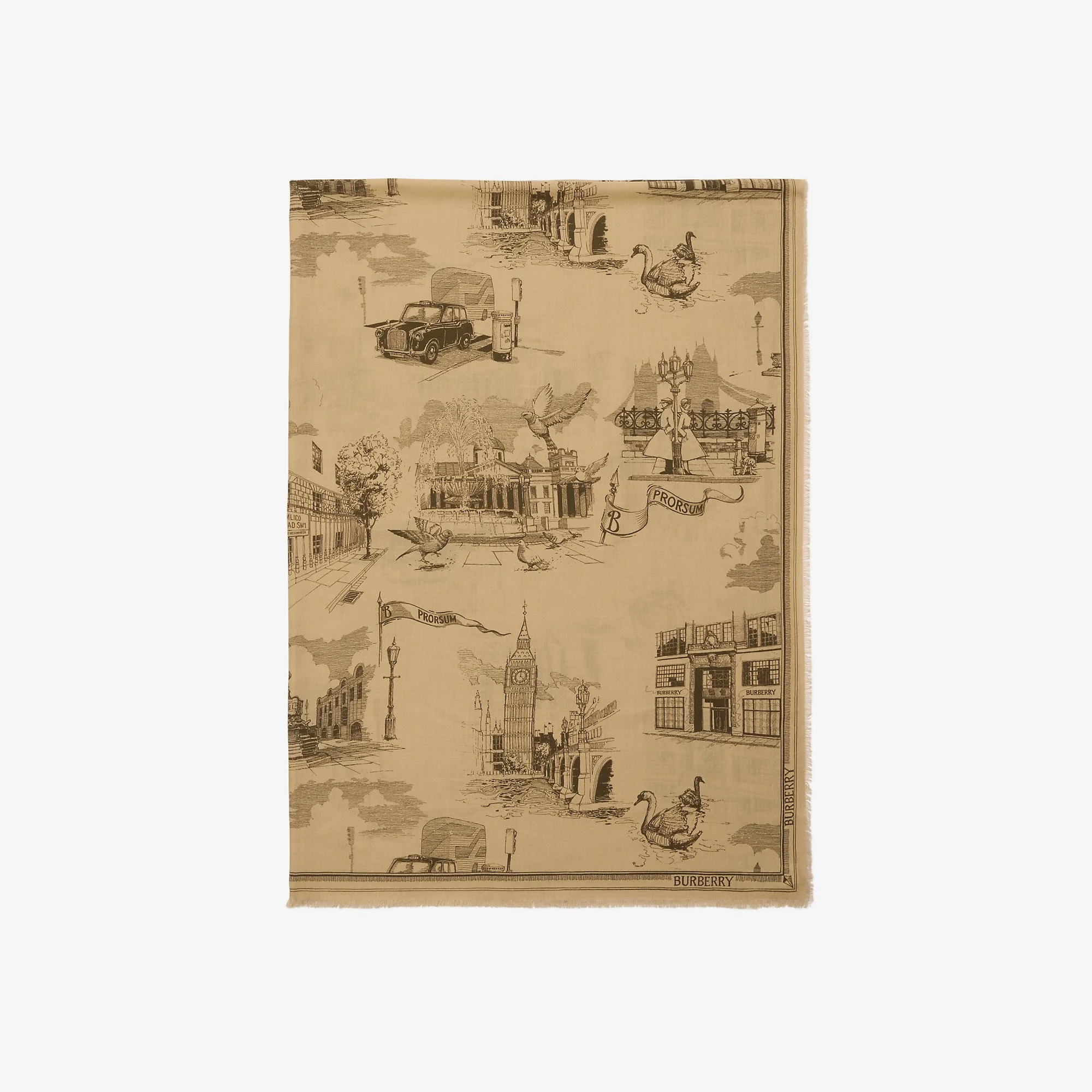 Product Details A lightweight scarf made in Italy from wool silk. The design is printed with hand-drawn artwork depicting iconic London landmarks including the Houses of Parliament, Tower Bridge, Trafalgar Square and our Horseferry House headquarters. - Rectangular - Eyelash fringing at edges - Printed Burberry lettering at border - Item 81129811 Size & Fit - 195 x 135cm/76.8 x 53.2in Fabric & Care - 50% wool, 50% silk - Specialist dry clean - Made in Italy