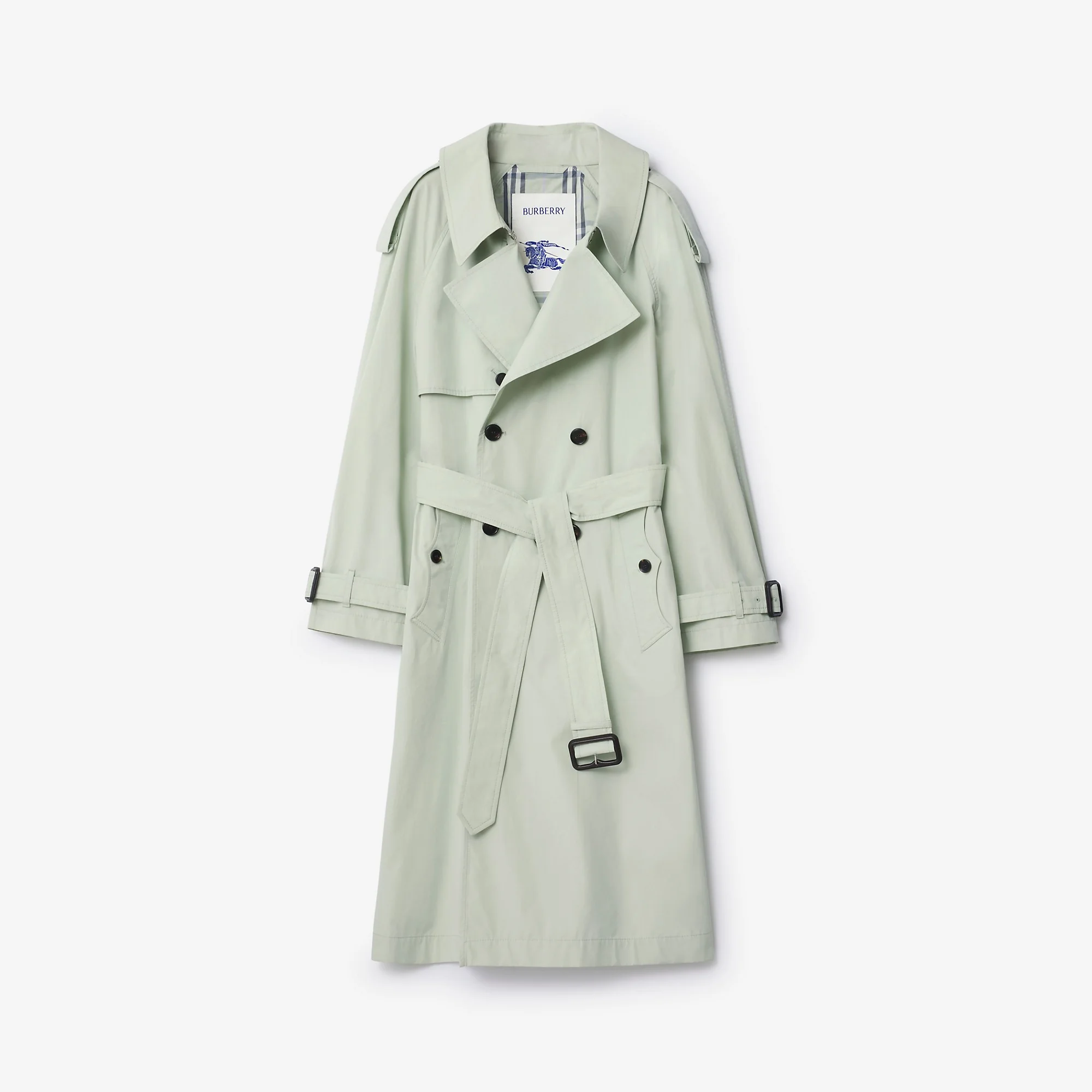 Product Details Relaxed fit: a looser cut than our regular fit. Adding volume to our signature rainwear, the Fitzrovia trench coat is cut from a structured cotton poplin canvas. The A-line style is shaped to a relaxed fit, featuring wider sleeves and a fuller skirt. Raglan construction gives a softer line at the shoulders while an archival trench inspires the curlicue shape of the pockets. Inside is Burberry Check cotton in a seasonal seafoam green colourway. - Double-breasted button closure - Hook collar closure - Throat latch - Epaulettes - Storm shield at back - Gun flap at shoulder - Leather B buckle belt and cuffs - Side button welt pockets - Back vent - Burberry Check lining and undercollar - Comes with a garment bag - Item 81185601 Size & Fit - Relaxed fit: a looser cut than our regular fit. - Length: 114cm/44.9in (size UK 6) - Model’s height: 175cm/5ft 9in. Model wears size UK 6 Fabric & Care - Outer: 100% cotton - Undercollar: 100% cotton - Lining: 100% cotton - Buckles: 100% calf leather - Buttons: buffalo horn - Specialist dry clean - Imported