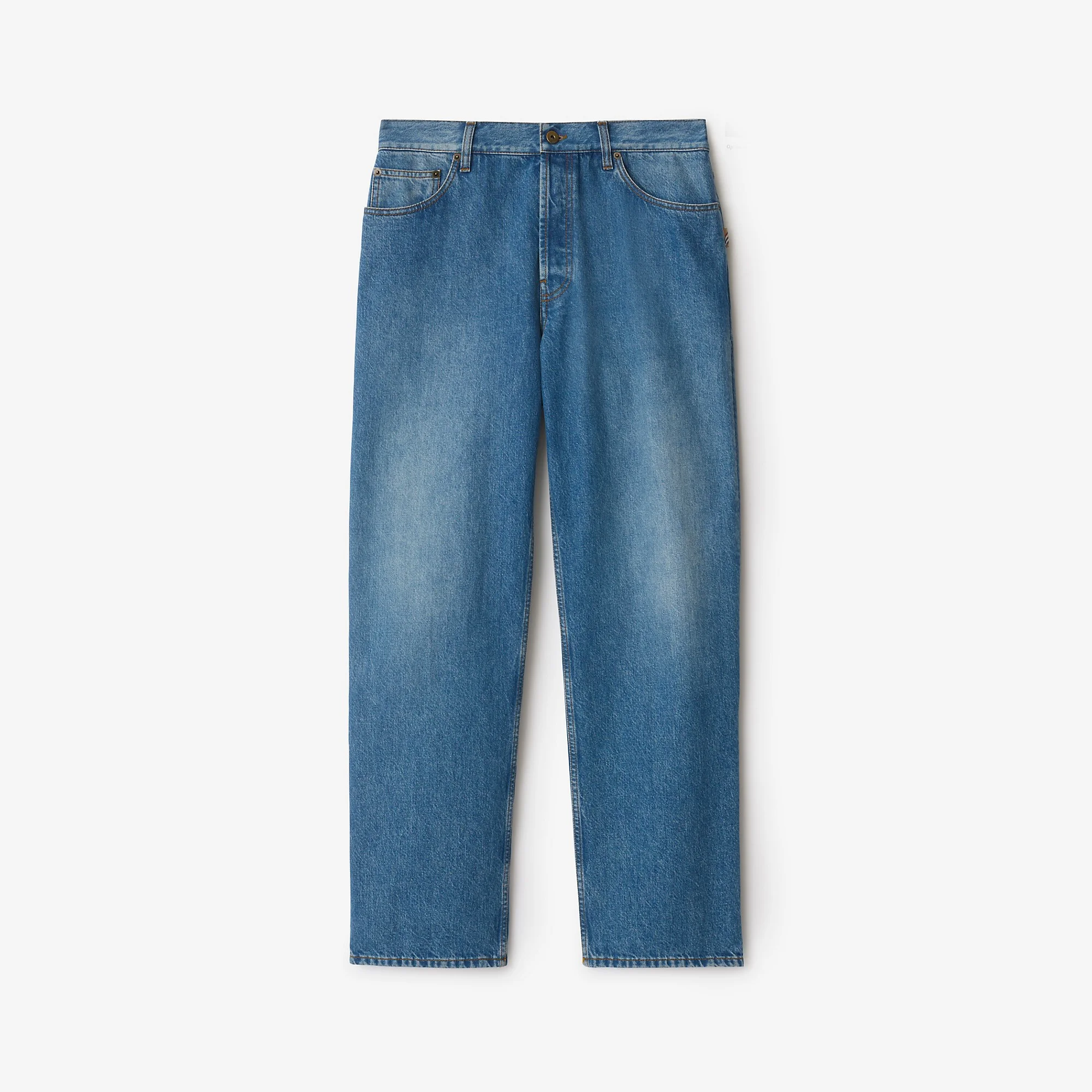 Product Details A pair of jeans made in Italy from heavyweight denim, cut to a loose fit. The five-pocket style is detailed with a Burberry Check tab and a suede patch embossed with the Equestrian Knight Design. - Button closure - Suede patch with Equestrian Knight Design at back - Loose: looser fit at hip, wide leg. - Machine wash inside out - Item 81111031 Size & Fit - Inside leg length: 81.5cm/32.1in (size UK 32) - Model's height: 184cm/6ft. Model wears size UK 32 Fabric & Care - 100% cotton - Trims: 100% lamb suede; 50% lamb suede, 50% calf leather - Made in Italy