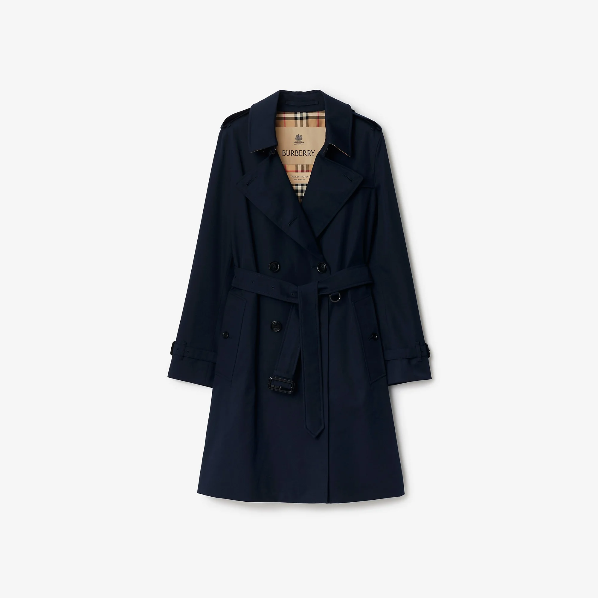 Product Details Regular fit. Fits true to size, take your normal size. Defined by classic proportions, the Kensington trench coat is crafted for timeless elegance. Made in England from shower-resistant cotton gabardine, woven at the Burberry Mill, the coat is lined with the iconic Burberry Check and finished with heritage details. It is tailored to a regular fit with a structured shoulder, while added ease through the body allows for effortless layering. - Double-breasted button closure - Hook-and-eye collar closure - Throat latch - Epaulettes - Storm shield at back - Gun flap at shoulder - Leather buckle belt and cuffs - Side button welt pockets - Back button vent - Burberry Check lining and undercollar - Comes with a garment bag - Item 81172581 Size & Fit - Regular fit. Fits true to size, take your normal size. - Length: 96cm/37.8in (size UK 8) - Model’s height: 177cm/5ft 10in. Model wears size UK 8 Fabric & Care - Outer: 100% cotton* - Lining: 100% cotton* - Sleeve lining: 100% viscose - Buckles: 100% calf leather - *The main material and body lining of this product contain 100% organic cotton - Specialist dry clean - Made in Yorkshire, England