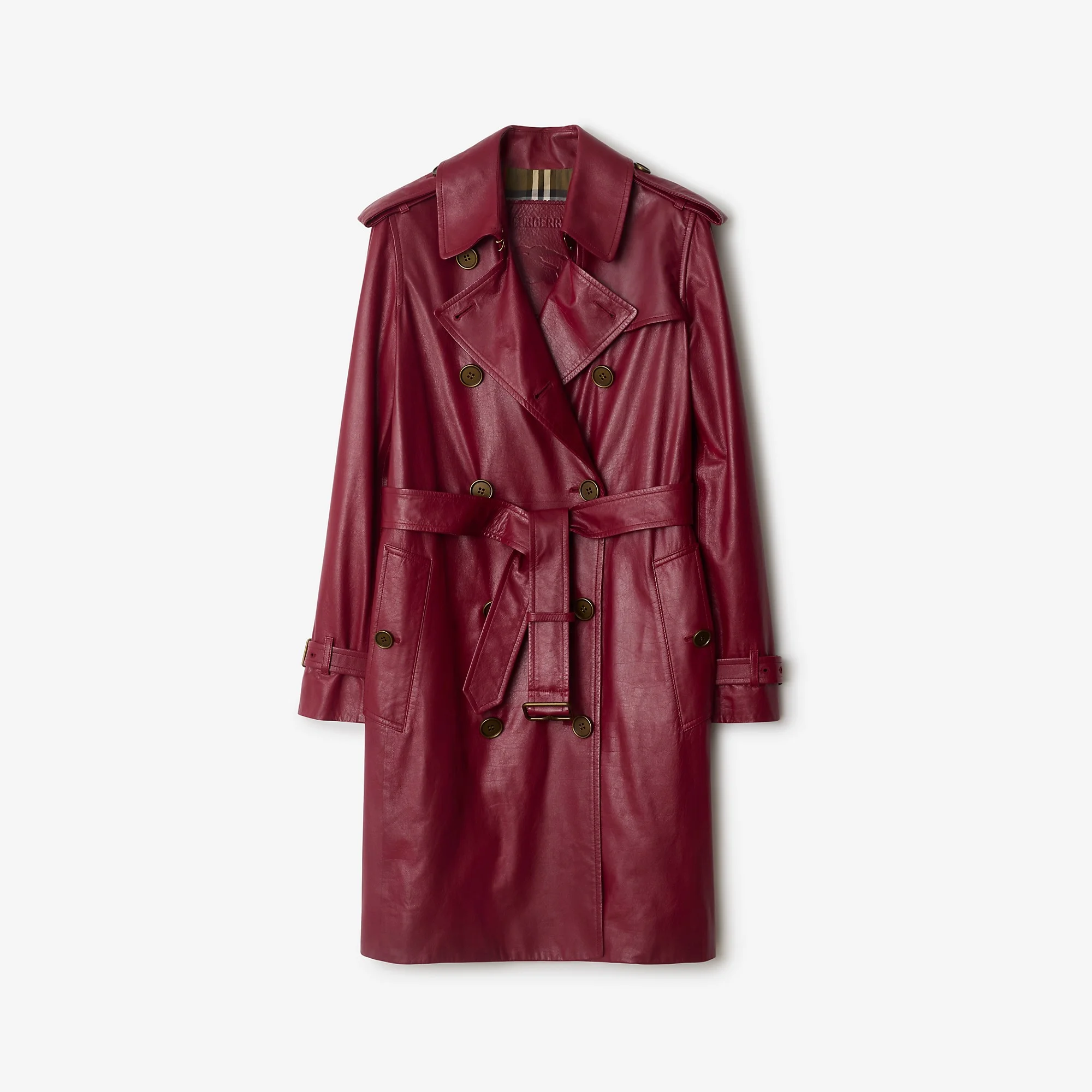 Product Details A fresh expression of the Kensington trench coat, made in Italy from soft calf leather. Inside is Burberry Check cotton in a seasonal moss colourway. The style is cut to a regular fit with set-in sleeves and features logo-engraved metal buttons with an antique finish. - Double-breasted button closure - Hook collar closure - Throat latch - Epaulettes - B buckle belt - Side button welt pockets - Belted cuffs - Back button vent - Burberry Check lining - Comes with a garment bag - Regular fit. Fits true to size, take your normal size. - Buckles: calf leather - Item 81100471 Size & Fit - Length: 95cm/37.4in (size UK 8) Fabric & Care - Outer: 100% calf leather - Lining: 100% cotton - Sleeve lining: 100% viscose - Specialist leather clean - Made in Italy