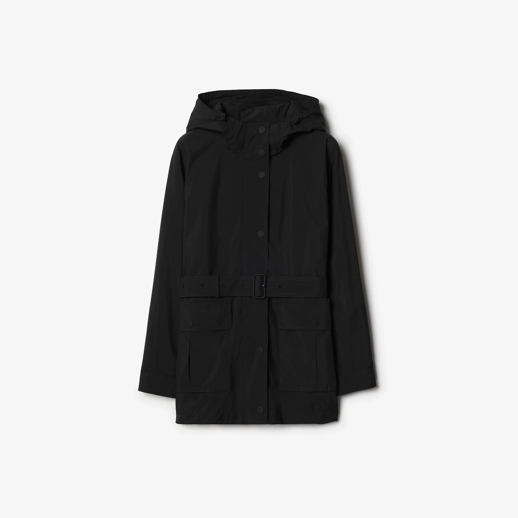 Product Details A hooded jacket in nylon, featuring our B buckle belt for an adjustable fit. The design is finished with logo embroidery in tonal lettering. - Press-stud and zip closure - Drawcord hood - B buckle belt - Side press-stud flap pockets - Press-stud cuffs - Embroidered Burberry lettering at pocket - Item 81114731 Size & Fit - Length: 74cm/29.1in (size UK 8) Fabric & Care - Outer: 100% polyamide - Lining: 100% polyamide - Embroidery: 100% polyester - Specialist dry clean - Imported