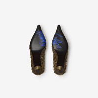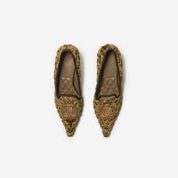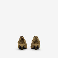 Product Details A pair of Cameo slippers made in Italy from quilted velvet, appliqued with a metallic B crest framed by a garland of oak leaves. Redefining classic British style, the design is tapered to a pointed toe inspired by 18th-century court shoes. The quilted leather insole is padded for comfort and the sole is embossed with the Equestrian Knight Design in signature Knight Blue. - Pointed toe - Quilted leather insole - Kitten heel - Equestrian Knight Design at sole - Comes with a dust bag - Item 81157021 Size & Fit - Heel height: 5.5cm/2.2in Fabric & Care - Upper: 90% polyester, 10% elastane - Heel: 90% polyester, 10% elastane - Lining: 90% sheep leather, 10% goat suede - Sole: 100% leather - Made in Italy