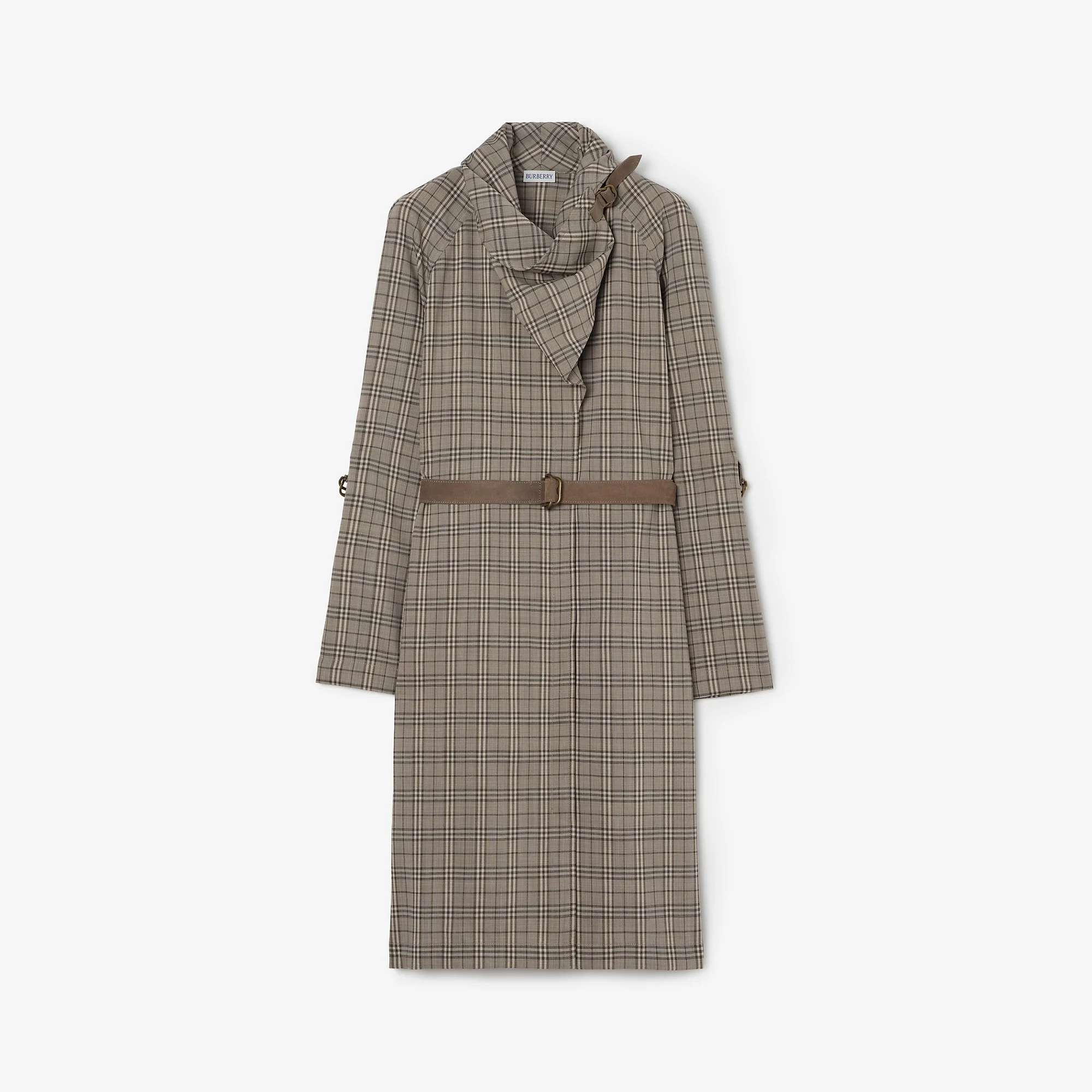 Product Details Regular fit. Fits true to size, take your normal size. A belted dress in wool with a hint of stretch, woven with the Burberry Check. The style is cut to a regular fit with a draped neckline, which can be worn open or secured like a scarf with a detachable suede throat latch. Use the matching B buckle straps to adjust the sleeve length. - Button closure - B buckle belt - Item 81181751 Size & Fit - Regular fit. Fits true to size, take your normal size. - Length: 100cm/39.4in (size UK 8) - Model’s height: 180cm/5ft 11in. Model wears size UK 8 Fabric & Care - 97% wool, 3% elastane - Trim: 100% calf suede - Pocket lining: 100% viscose - Buttons: mother-of-pearl - Specialist dry clean - Imported