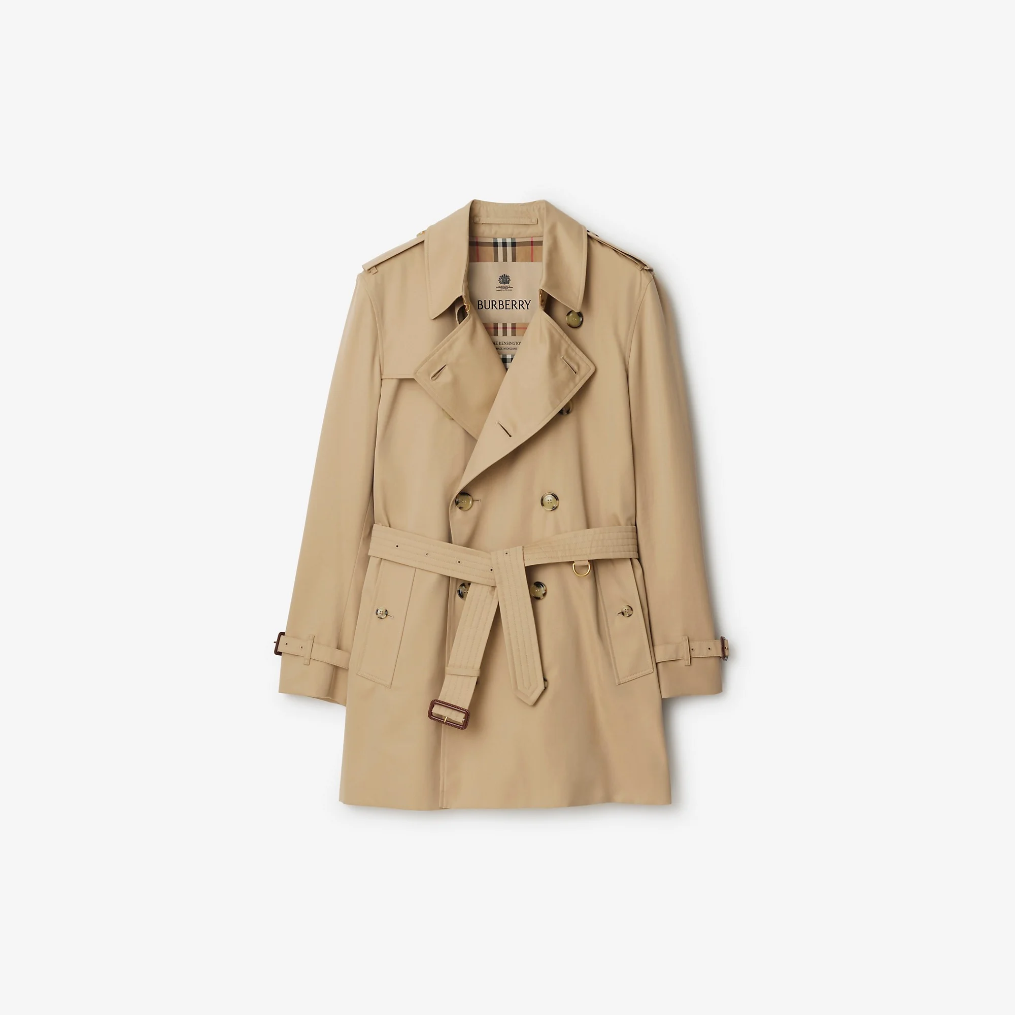 Product Details Regular fit. Fits true to size, take your normal size. Characterised by classic proportions, the Kensington trench coat is tailored to a regular fit with structured shoulders. The heritage silhouette is crafted in England from shower-resistant cotton gabardine and lined with the iconic check – both woven at the Burberry mill in Yorkshire. More room at the chest and through the body allows for lightweight layering, ideal for the city wardrobe. Signature details, including epaulettes and leather-wrapped buckles, complete the design. - Double-breasted button closure - Hook-and-eye collar closure - Throat latch - Epaulettes - Storm shield at back - Gun flap at shoulder - Leather buckle belt and cuffs - Side button welt pockets - Back button vent - Burberry Check lining and undercollar - Comes with a garment bag - Item 81172341 Size & Fit - Regular fit. Fits true to size, take your normal size. - Length: 89cm/35in (size IT 50) - Model’s height: 189cm/6ft 2in. Model wears size IT 50 Fabric & Care - Outer: 100% cotton* - Lining: 100% cotton* - Sleeve lining: 100% viscose - Buckles: 100% calf leather - *The main material and body lining of this product contain 100% organic cotton - Specialist dry clean - Made in Yorkshire, England