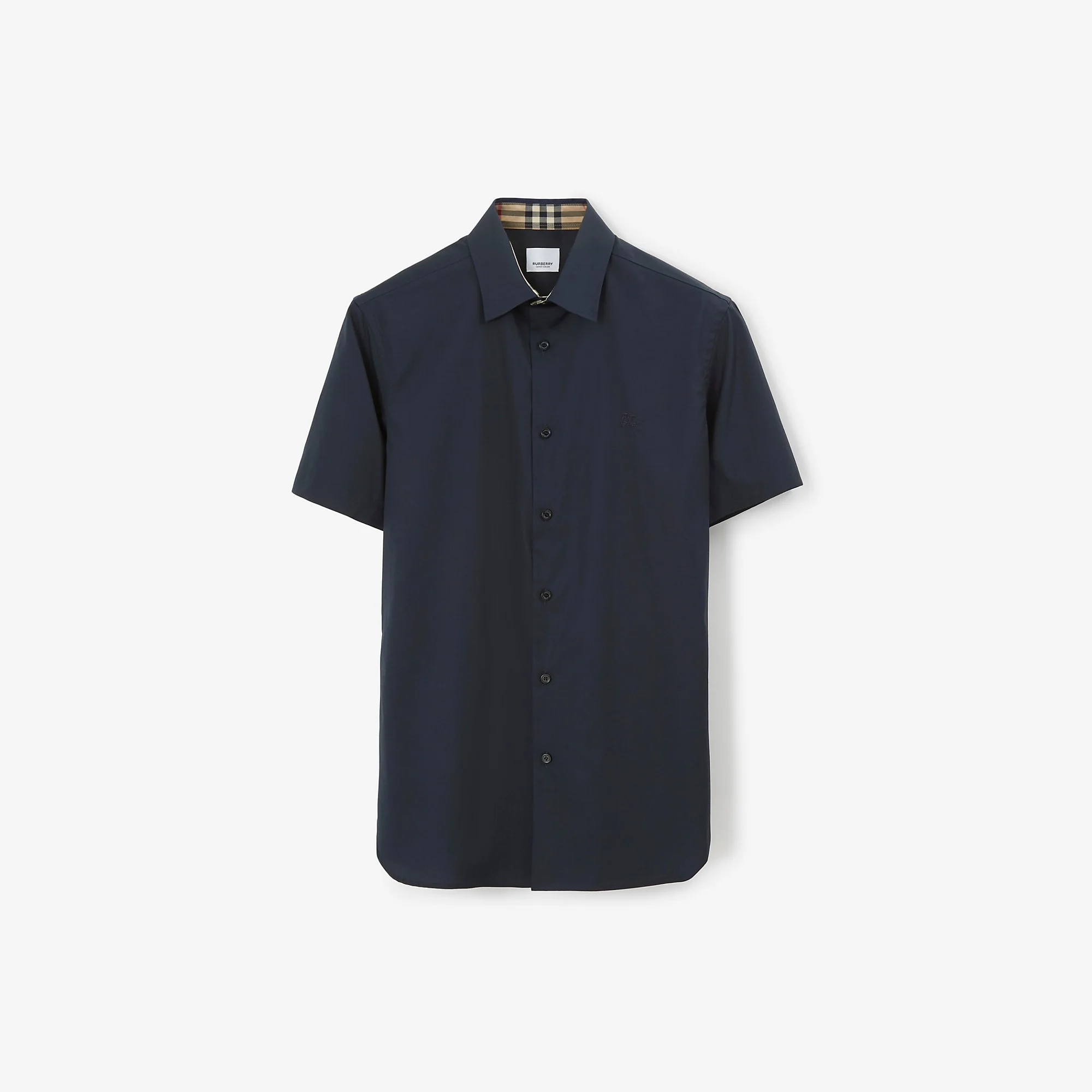 Product Details Slim fit: this style is cut to a fitted silhouette. Fits true to size, take your normal size. A short-sleeved shirt in stretch cotton, embroidered with the Equestrian Knight Design. Tailored to a slim fit, the style is lined with Burberry Check at the collar and cuffs. - Button closure - Spread collar - Curved hem - Embroidered Equestrian Knight Design at chest - Machine wash - *Containing organic cotton - Item 80795951 Size & Fit - Slim fit: this style is cut to a fitted silhouette. Fits true to size, take your normal size. - Length: 77cm/30.3in (size UK M) - Model’s height: 189cm/6ft 2in. Model wears size UK M Fabric & Care - 96% cotton, 4% elastane* - Buttons: mother-of-pearl - Imported
