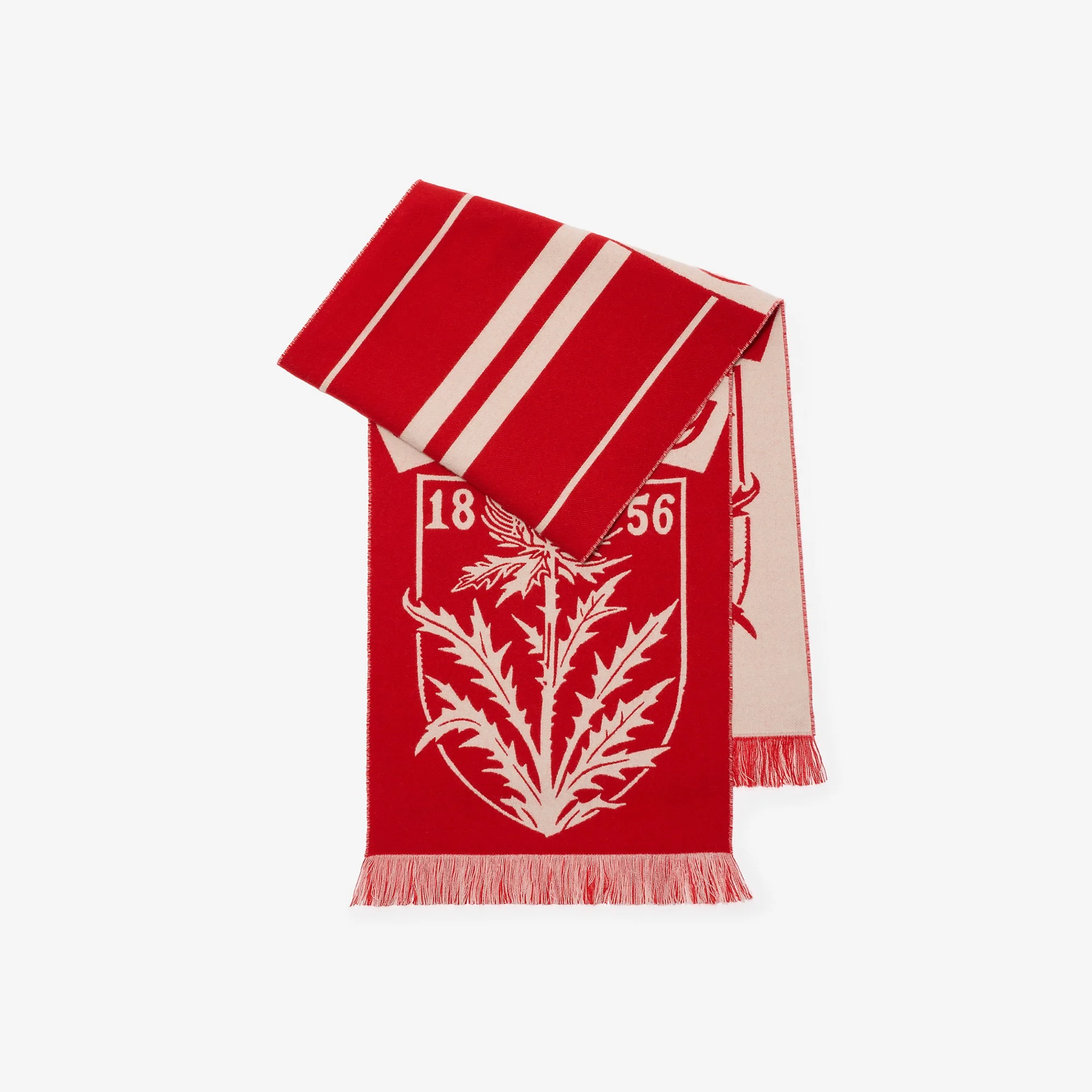 Product Details A scarf made in Italy from wool, woven with seasonal motifs and a cursive logo. Inspired by sports scarves, the design features the thistle shield, stripes, and the year Burberry was founded. - Rectangular - Eyelash fringing at both ends - Woven Burberry lettering - Item 81177011 Size & Fit - 168 x 33cm/66.1 x 13in Fabric & Care - 100% wool - Specialist dry clean - Made in Italy