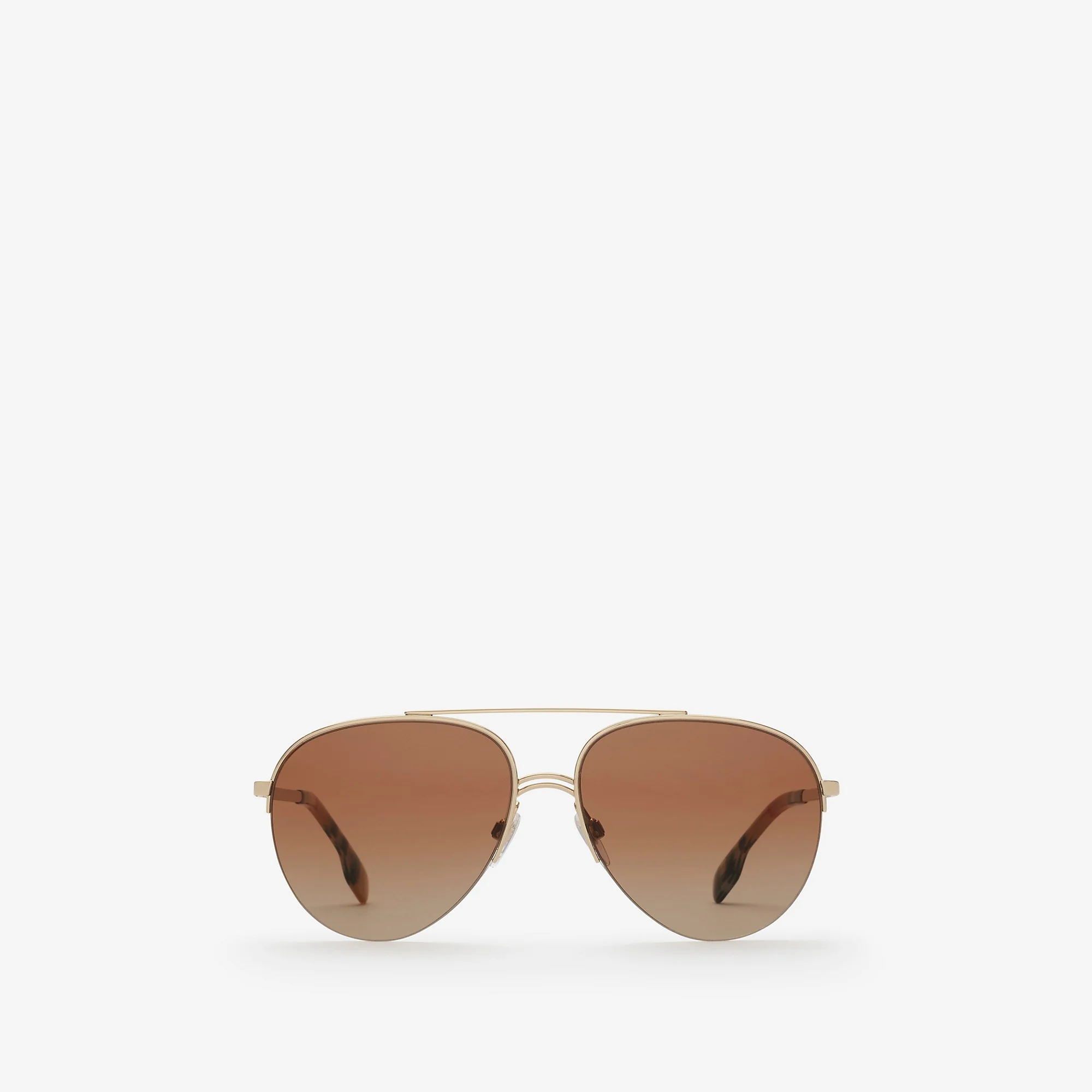 Product Details A classic pilot frame in light gold-tone metal, reimagined with half-rim lenses. The logo-tagged temples feature a distinctively shaped tip in Vintage check acetate, inspired by our signature trench lapel. - Metal and acetate frame - Engraved Burberry lettering at temple - Item 40807581 Size & Fit - Frame width: 14.1cm/5.6in. Frame height: 5.7cm/2.2in Fabric & Care - Scratch-resistant gradient light brown lenses with 100% UV protection - Comes with a hard leather case and cleaning cloth - Made in Italy