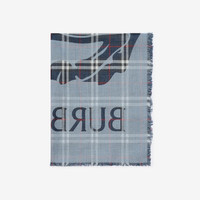 Product Details A wide scarf made in Italy from lightweight wool silk, designed for year-round wear. The style is jacquard-woven with our Equestrian Knight Design, logo and the Burberry Check in a seasonal ink blue colourway. - Rectangular - Eyelash fringing at the edges - Item 81179021 Size & Fit - 200 x 70cm/78.7 x 25.6in Fabric & Care - 52% wool, 48% silk - Dry clean - Made in Italy