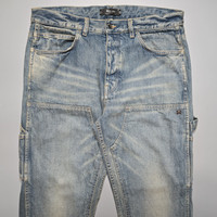 Amiri - Clay Indigo Washed Double-Knee Carpenter Jeans - Straight Size 32 fits 34" Waist Gently Used Very Good Condition Product Information Non-stretch denim jeans. Fading and whiskering throughout. · Paneled construction · Belt loops · Five-pocket styling · Button-fly · Button vent at cuffs · Hammer loop at outseam · Patch pockets at outseams · Leather logo patch at back waistband · Logo plaque at back pocket · Logo-engraved silver-tone hardware Supplier color: Clay indigo 100% cotton. Made in United States.