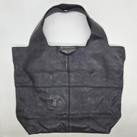 Givenchy - George V Apron Tote Bag Measurements: H 15" x W 12" x D 4" Handle Drop: 7" Gently Used Very Good Condition Product Information: This luxurious shoulder bag is the perfect addition to your everyday bag collection. This 'George V' bag features navy blue Zanzi lambskin leather, which is known for being soft and delicate. This shopper bag has a unique wide strap design that is perfect as a carry all. The signature envelope fold Givenchy logo with a raised metal logo plaque that is synonymous with the Antigona line sits at the front. Retail price is $1340. The exterior is clean but shows minor hairline scratches throughout. The bottom corners show signs of wear. The glazing on the edges of the handles is cracked and splitting. The interior is clean and in great condition throughout.
