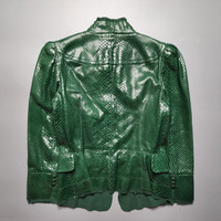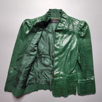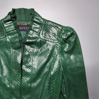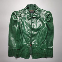Gucci by Frida Giannini - SS06 Runway Phyton Leather Jacket Size 38 fits Small Gender: Womens Gently Used Great Condition Stunning Gucci green python structured jacket with slight peplum and tonal suede trim. Approx retail price: $6995.00 Measurements: Bust 32", Waist 28", Length 21", Sleeve 19", Inseam ~13", Across Back 13" Material: 100% real python, 100% leather trim, Lining: 100% Silk Condition: Very good, worn once, couple of small places where python is slightly raised - otherwise there are no visible signs of wear Details: - Slight peplum - Small gold-tone belt closure at waist - Collar and sleeves feature all around knife-pleating in tonal suede - Gathering at shoulders - Three gold and green buttons on each cuff featuring GG - Dual flap pockets at front - Sleeves extend to just past elbows - Fully lined in green silk - Made in Italy